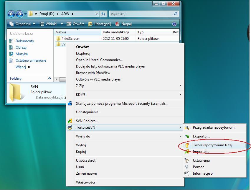 3b. Klikamy prawym na katalogu i wybieramy TortoiseSVN->Twórz repozytorium tutaj