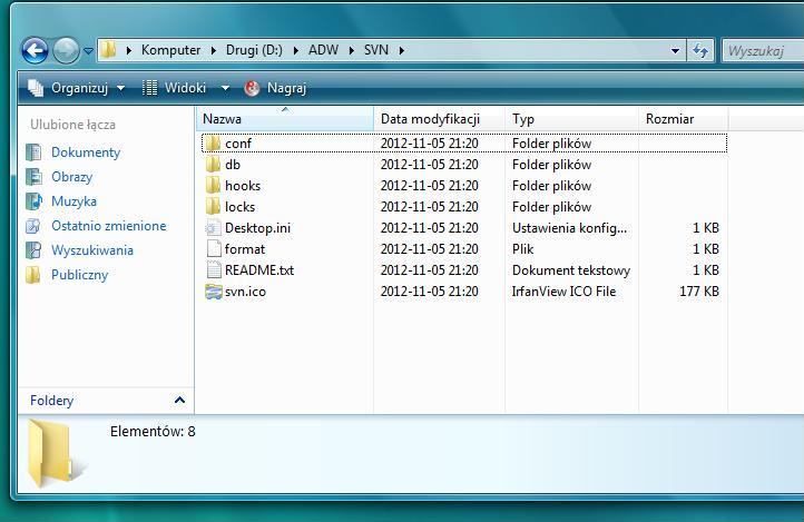 a w katalogu D:\ADW\Projekty pojawi się katalogu .svn (widoczny on jest tylko gdy ustawimy w eksploratorze windows widoczność ukrytych plików)