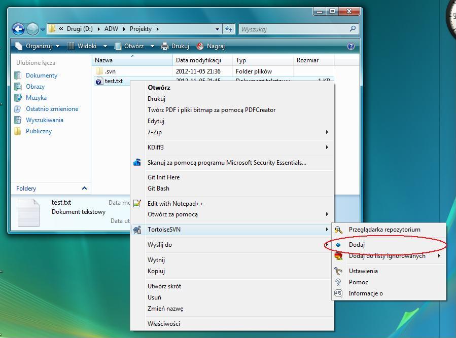 5b. Aby dodać plik do kontroli wersji, klikamy prawym i wybieramy TortoiseSVN->Dodaj