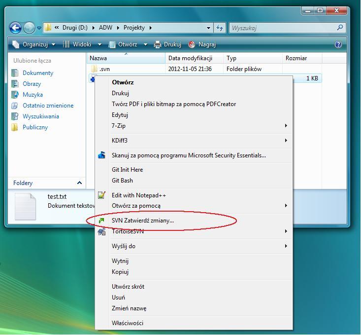 5c. Aby przesłać plik i zmiany do repozytorium, klikamy prawym i wybieramy TortoiseSVN->SVN Zatwierdz zmiany