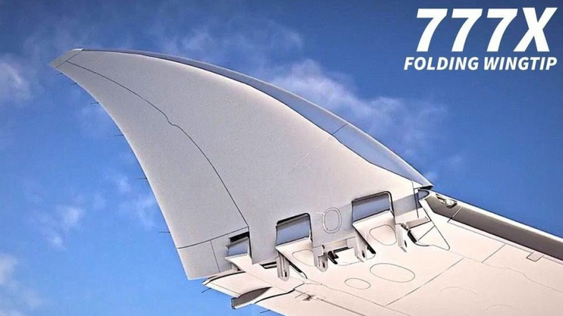 "...chodzi tu o siedmiometrowe końcówki skrzydeł, które są rozkładane w czasie lotu, a gdy samolot przebywa na ziemi składają się w górę skracając szerokość (rozpiętość <sic!>) skrzydeł z 72 do 65 metrów. Dzięki temu samolot będzie bez problemu obsługiwany na wszystkich lotniskach świata bez potrzeby ich modyfikacji pod szersze skrzydła, jak u innych modeli Boeinga 777."Siedmiometrowe końcówki to też "chwyt", bo każda ma 3,5 metra. Jednakże jest to pierwszy komunikacyjny samolot z taką konstrukcją co stawi ciekawostkę.