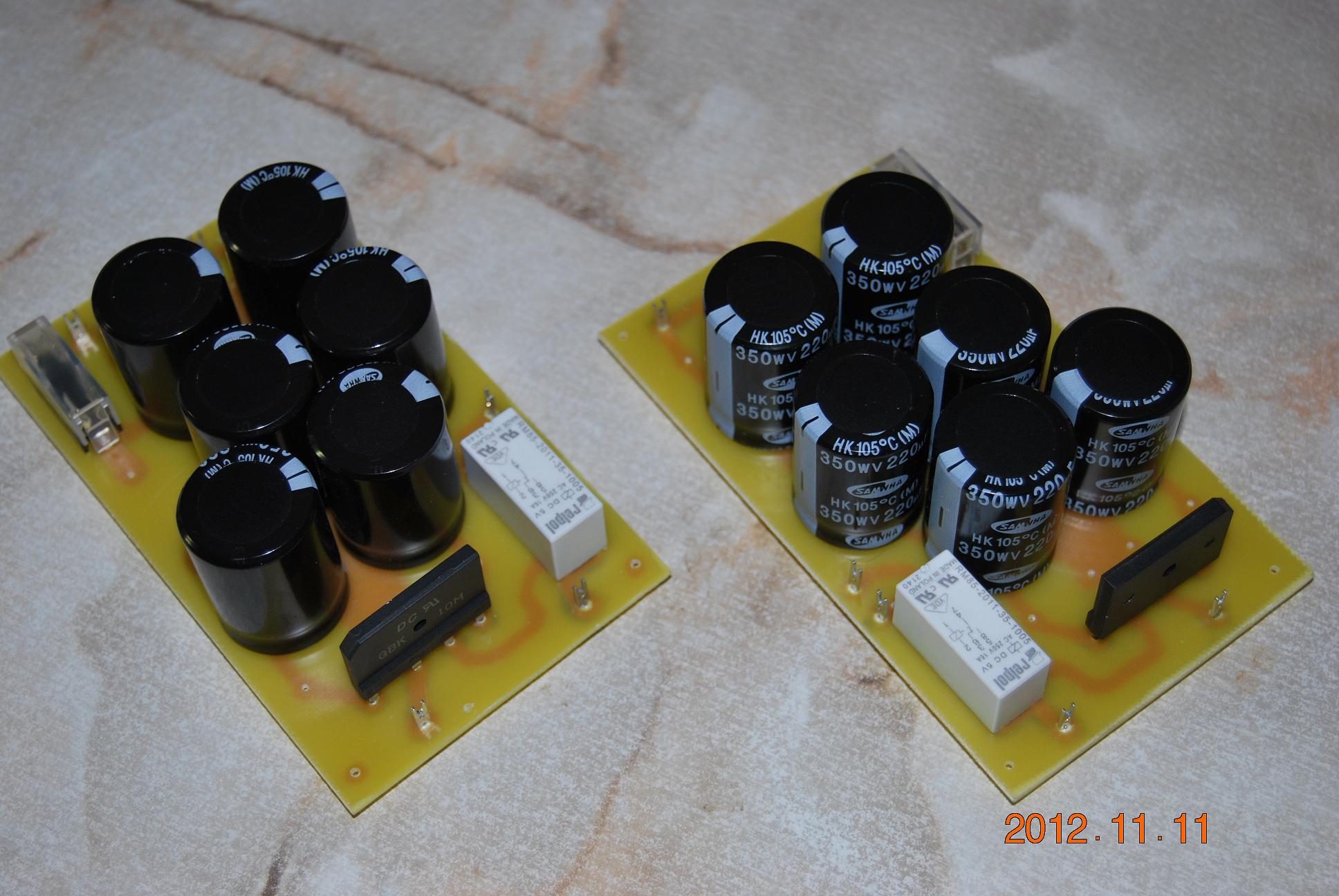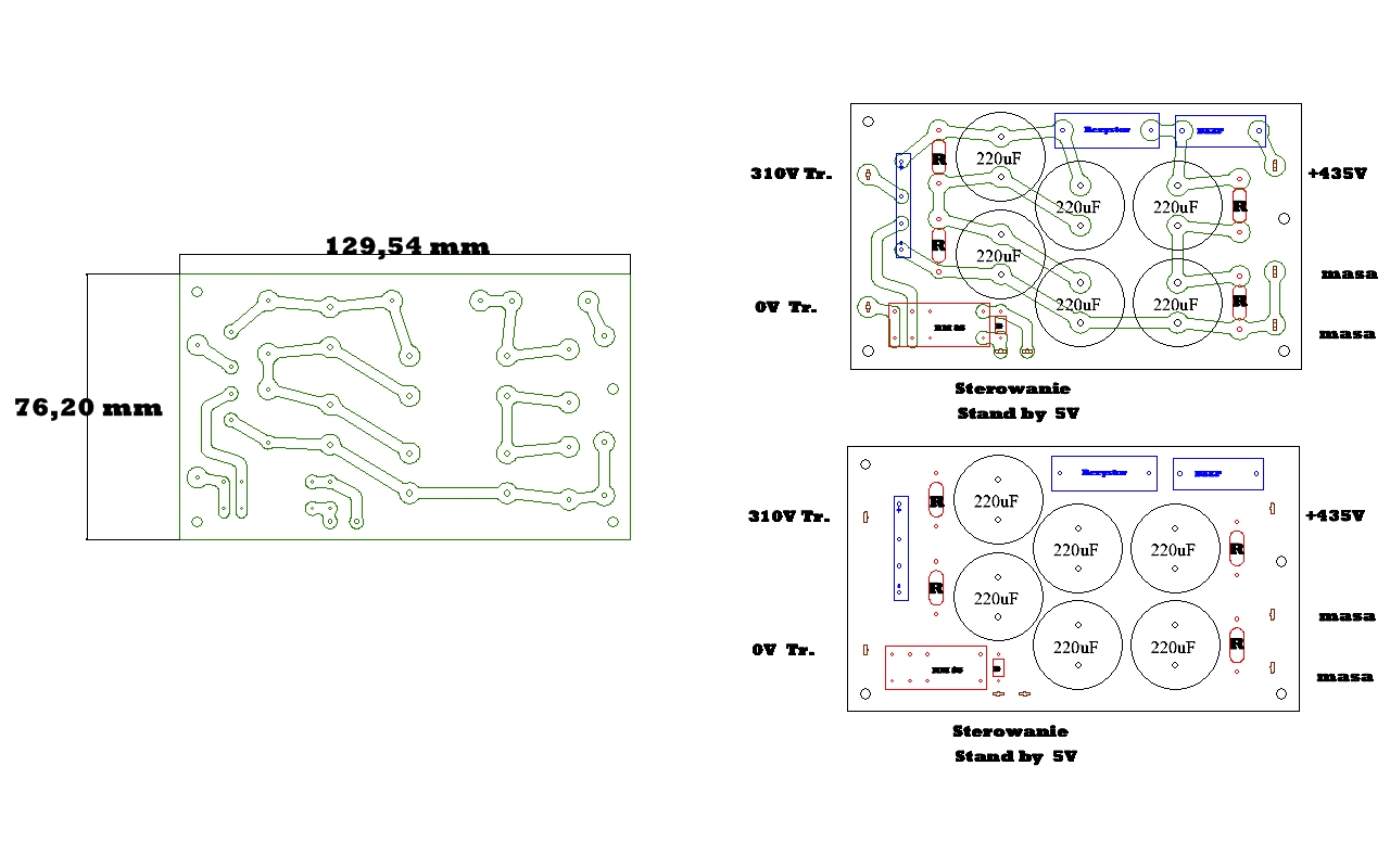 Zrobiłem płytki zasilaczy anodowych, brakuje tylko rezystorów. Zasilacze zamieniają napięcie z transformatora (310V) na napięcie stałe 437V (bez obciążenia) . Pod obciążeniem napięcie trochę spadnie. Widoczne przekaźniki mają za zadanie opóźnić zasilanie lamp wysokim napięciem po załączeniu wzmacniacza o około 45-60sekund. Oczywiście będą one sterowane przez układ opóźniający. Czekam na kolejne elementy z TME i ELFY
