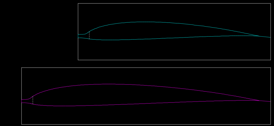 Profil SD7037 u nasady i SD7032 na końcówce. Cięciwy 210/160 mm. Zarys skrzydła: