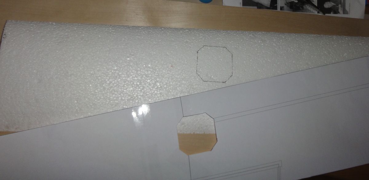 Centropłat będzie dopasowany do kadłuba istniejącego modelu i przykręcony do niego śrubami nylonowymi. Skrzydła będą spinane ze sobą gumą. Preferuję taki sposób składania modelu niż wkręcanie śrub. Centropłata nie mogę na stałe wkleić w kadłub, gdyż w tym miejscu mam dostęp do serw i odbiornik. Chciałem też uzyskać rozpiętość 2,2 m a płaty cięte były z metrowych płyt styropianowych... Dodatkowo przetestuję technologię na małym fragmencie. Łatwiej zrobić na nowo mała cześć niż połówkę płata ;)