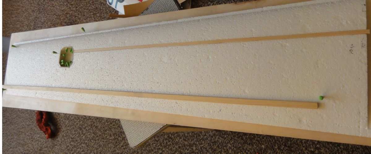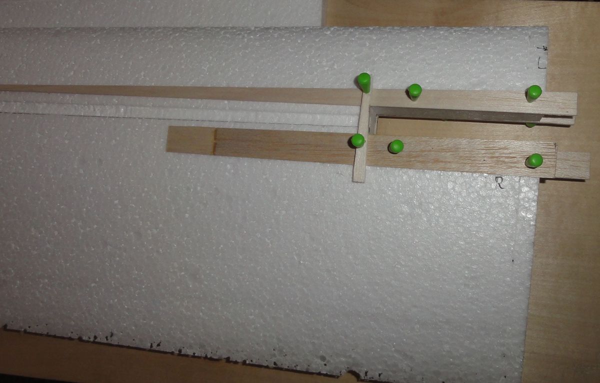 Rdzenie uzbrojone. W wycięcie pod serwo lotki włożyłem styropian aby fornir położył się równo (wierzch styropianu okleiłem taśmą - aby równo odszedł ;) ). Żebro nasadowe ze sklejki, końcowe z balsy.