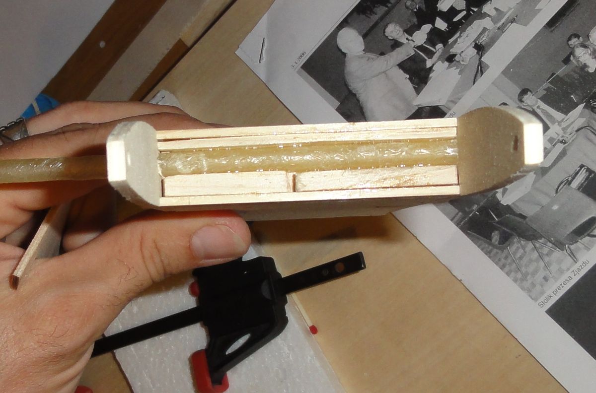 Wykleiłem gniazdo serwa balsą i wyciąłem gorącym drutem rowek pod dźwigary: