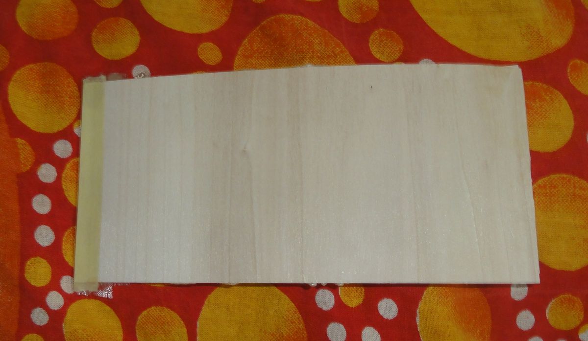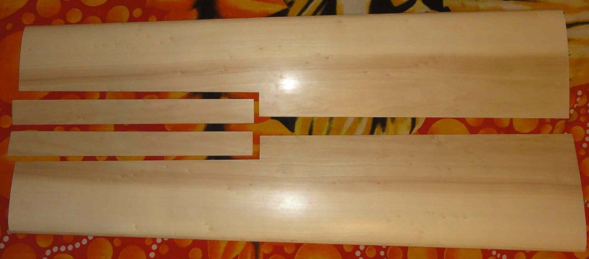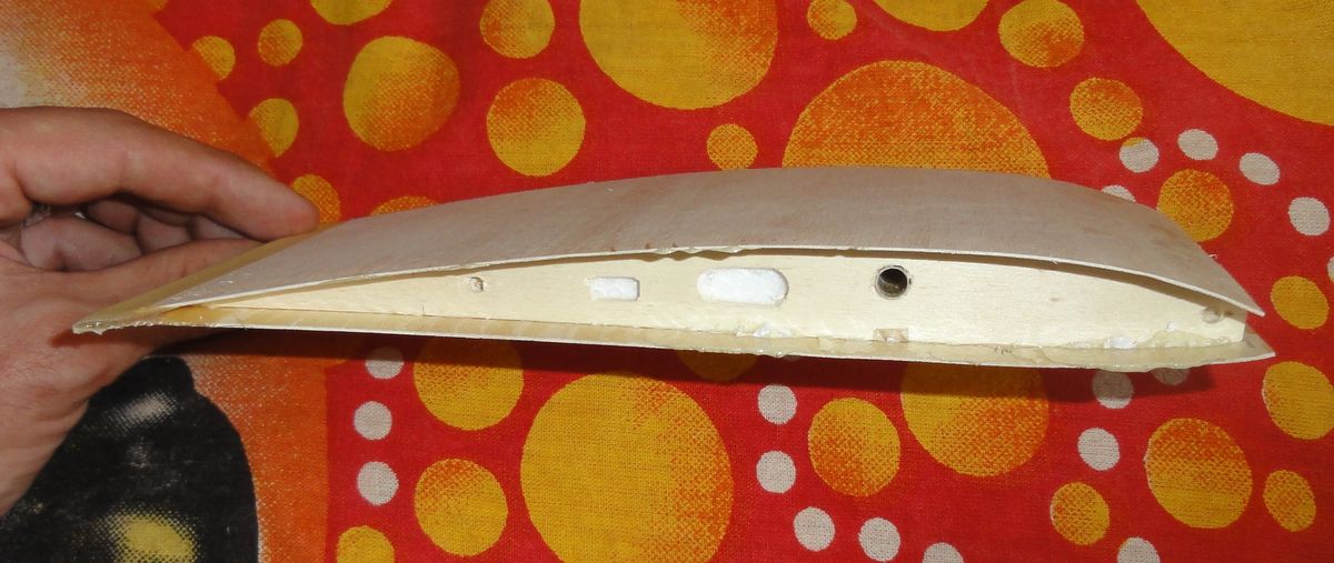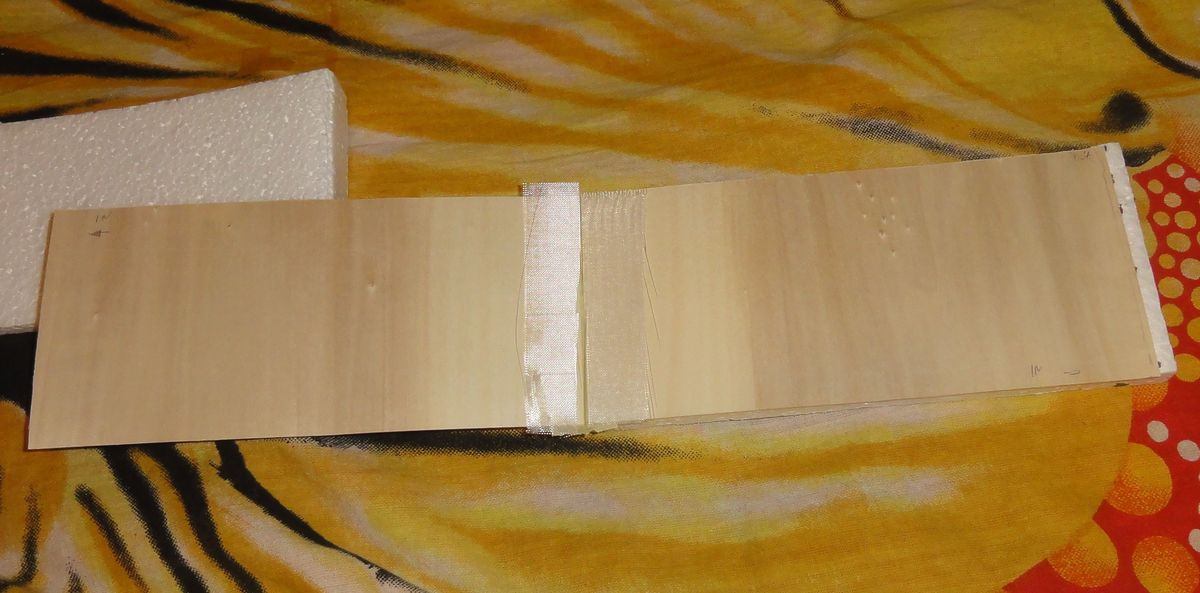Pokrycie to fornir topolowy. Zakupiłem kiedyś takowy o grubości 0,6 mm a gdy przyszedł okazał się 0,8 :shock: Za pomocą szlifierki oscylacyjnej zebrałem te 0,2 mm - jakby nie liczyć to 25% masy 8-) . Spływ sklejony taśmą malarską (zawias):