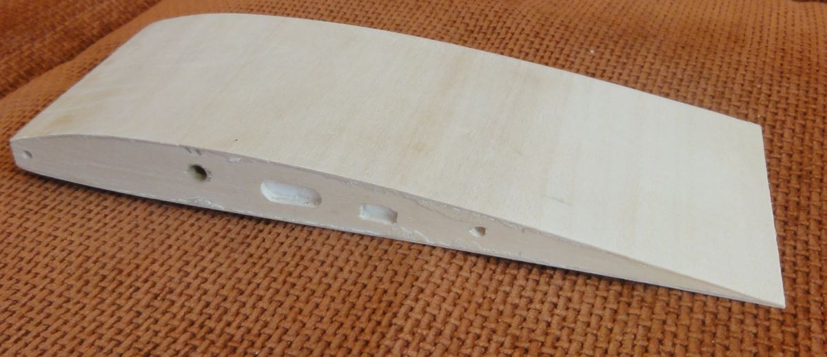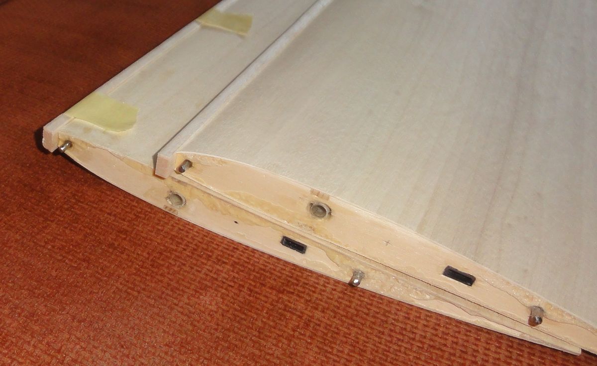 Następnie ustaliłem odpowiednie wzniosy skrzydeł na desce i wkleiłem kieszenie bagnetu (poliuretan) oraz kołki ustalające.