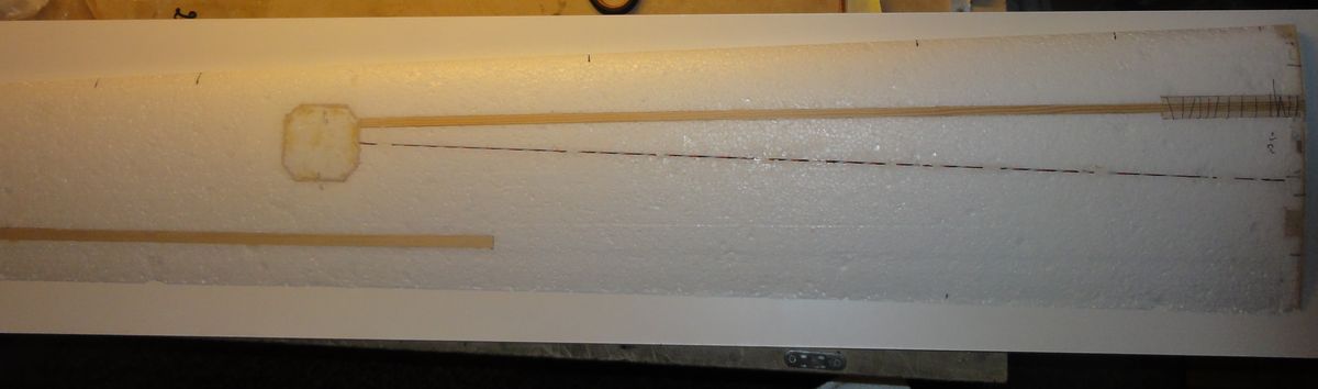 Zabrałem się za centropłat, który będzie przykręcony do kadłuba. Okazało się że rdzeń różni się dość znacznie w przedniej części od zakładanego profilu :evil: więc musiałem wyciąć nowy. Wkleiłem dźwigary, pochwę bagnetu, balsowe klocki wzmacniające. Dodatkowo trochę szpachli dla wyrównania: