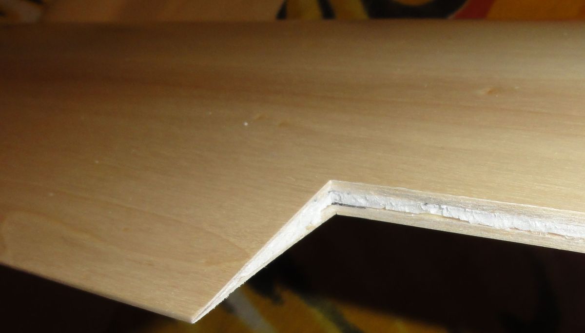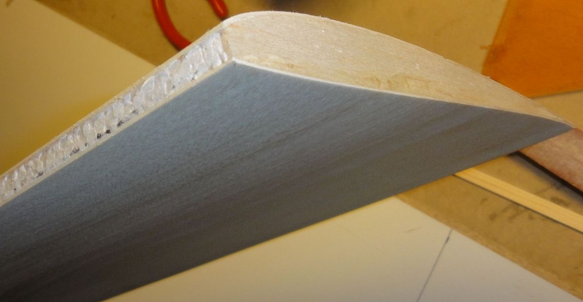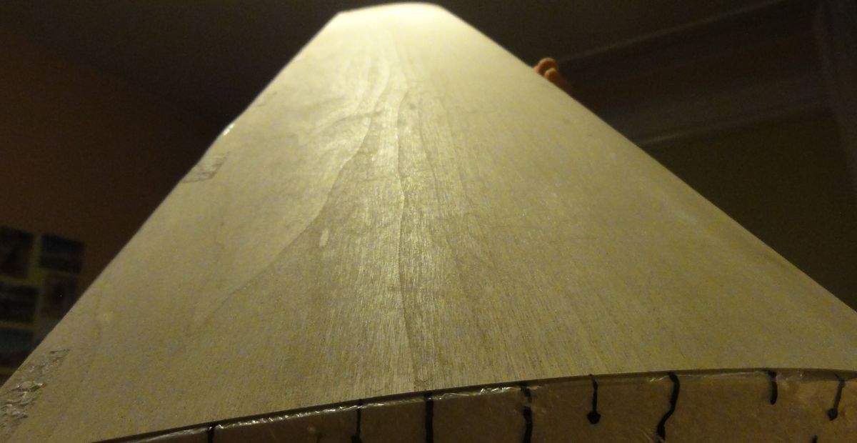 Fornir w sumie dobrze przykleił się do rdzenia. Jedynie w miejscu wycięcia po serwo lotek jest zafalowanie - ale i tak ta część będzie wycięta (klapka).