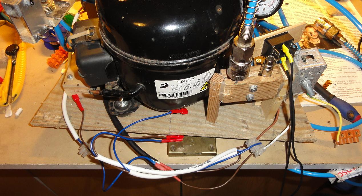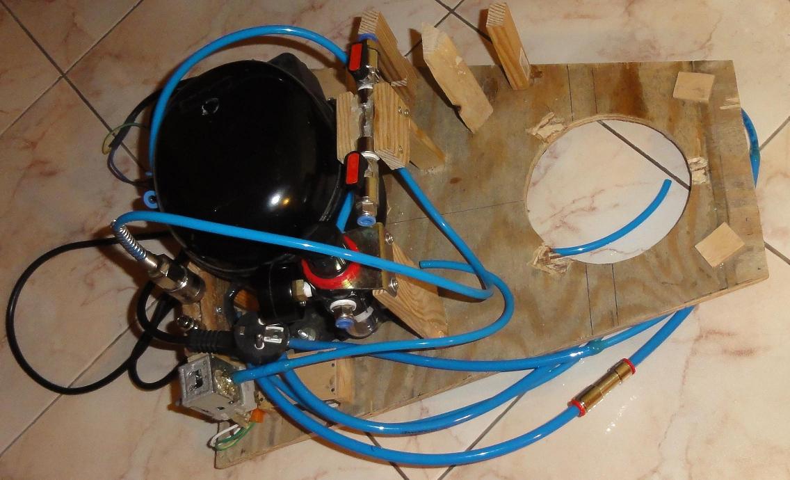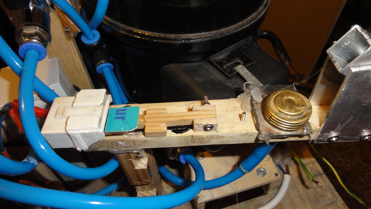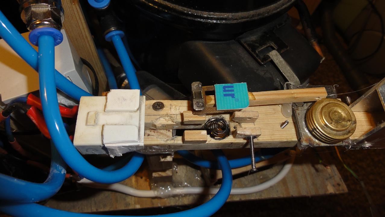 Wykonałem wyłącznik podciśnienia wykorzystując mieszek ze starego termostatu oraz jego styki. Po kilku zmianach położeń elementów udało się osiągnąć zadowalający rezultat. Zasada działania jest bardzo prosta - podciśnienie ściska mieszek (w którym jest sprężyna). Pociąga to za sobą obrót górnego ramienia które "połączone" jest z mieszkiem śrubą (dla regulacji). Sprężyna (również na śrubie dla regulacji) ciągnie górne ramię ku podstawie. Górne ramie opadając naciska kolejną śrubą na obrotowe dolne ramię, na końcu którego są styki rozłączając zasilanie. Zwiększenie ciśnienia powoduje rozszerzenie się mieszka, podniesienie górnego ramienia a co za tym idzie również dolnego (na sprężynie) i zwarcie styków. Regulując śrubą naciskającą na dolne ramię - ustawiam wartość podciśnienia przy której styki rozłączają napięcie. Zdjęcia poglądowe z opisem uzupełniającym: