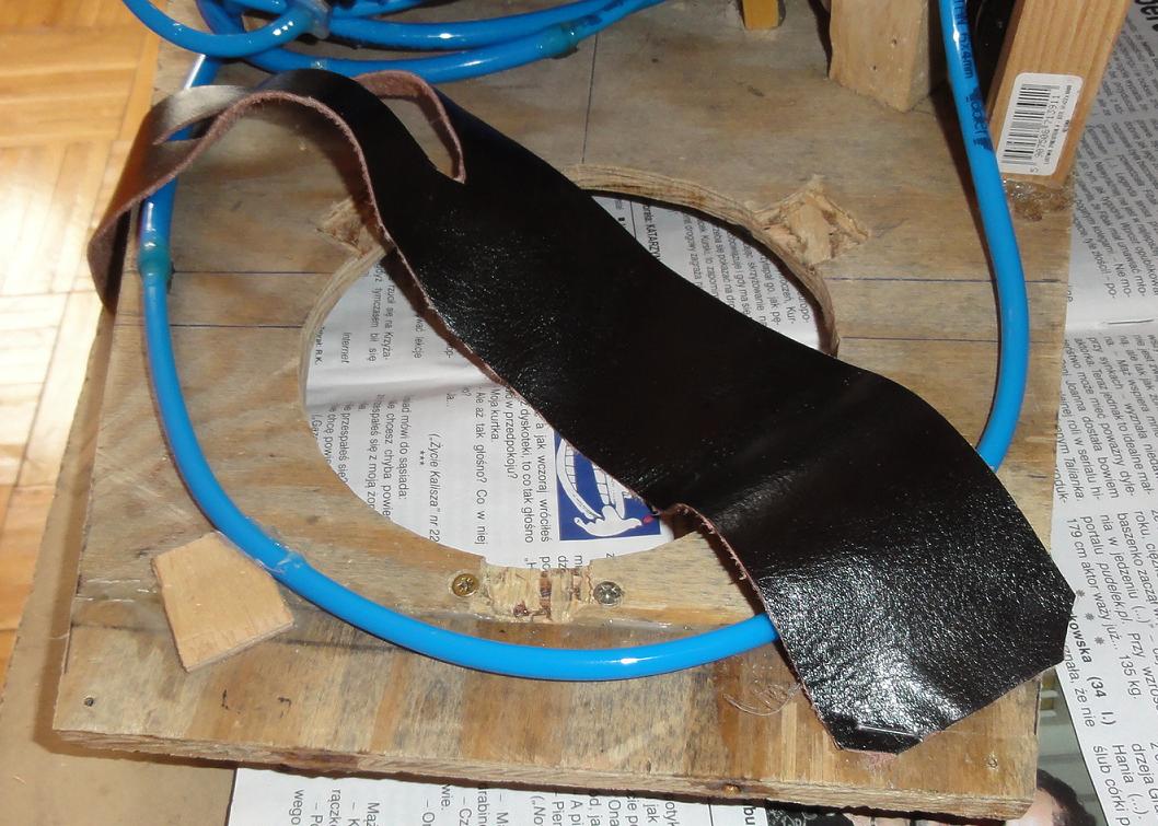 Dolne ramię z płytką styków (poniżej sprężyna dociskająca ramię do styków). Po lewej białe gniazdo styków, po prawej mieszek