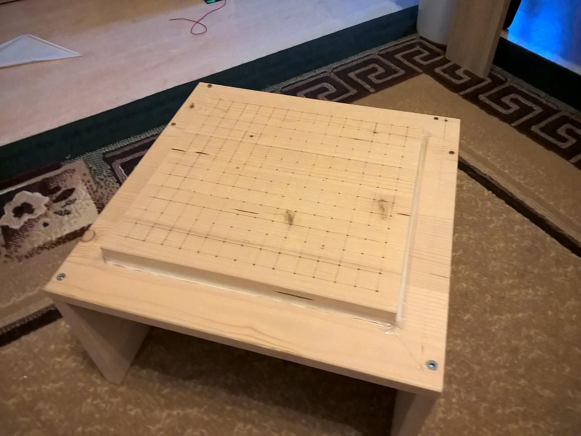 Aby uzyskać wszędzie tą samą odległość wspomniane wcześniej nakrętki złapałem na akryl w narożnikach i na to blat roboczy.