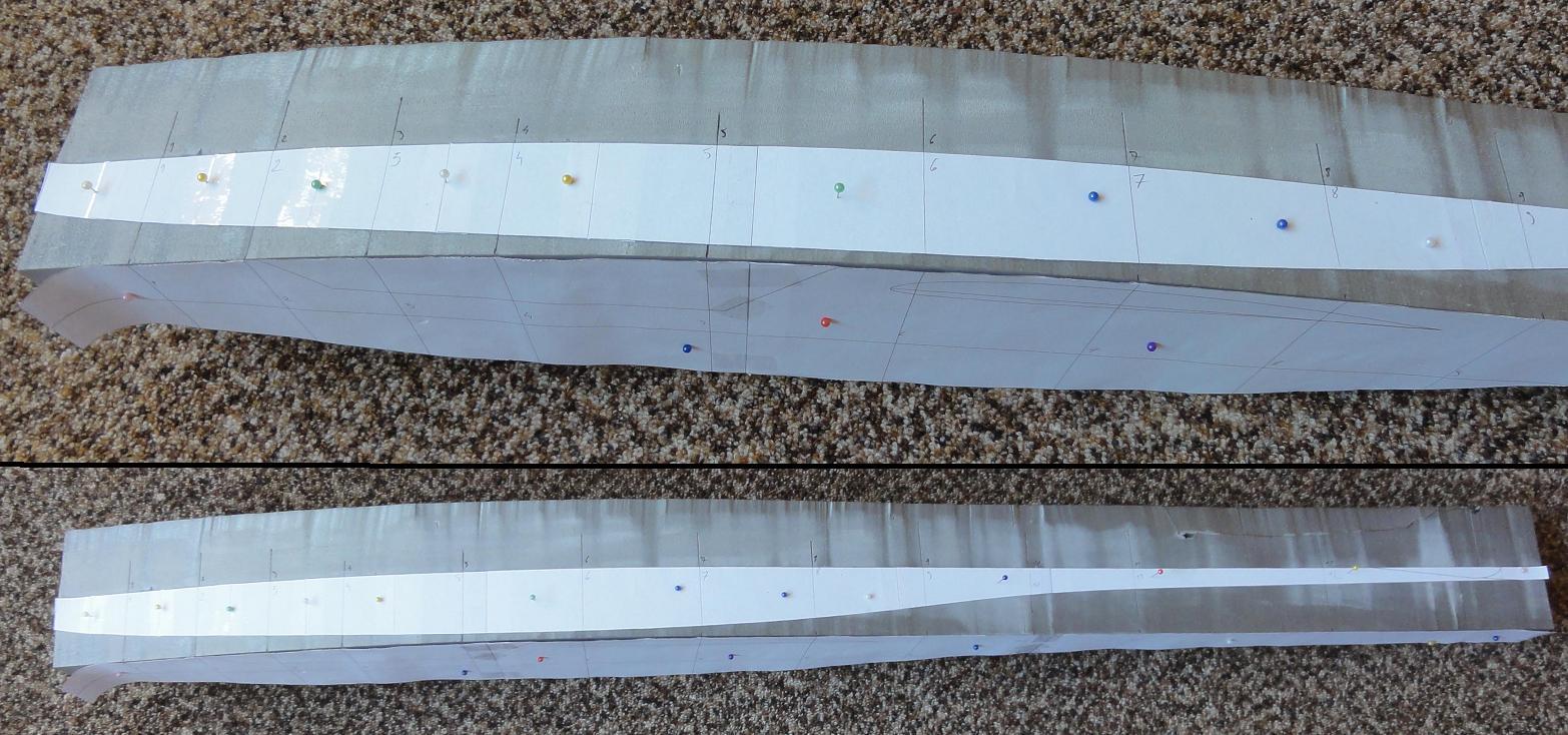 Na kartonie (np. opakowania po produktach spożywczych) narysuj i wytnij górny i boczny kształt kadłuba (szablony) w dwóch egzemplarzach. Przytnij styropian na długość i szerokość kadłuba. Można skleić dwie, lub więcej płyt styropianu aby uzyskać odpowiednia grubość. Ma to dodatkowa zaletę, że automatycznie mamy zaznaczoną oś symetrii kadłuba. Wystarczy skleić je w kilku punktach żywica 5 min ale w takich przez które nie będziemy potem ciąć drutem.