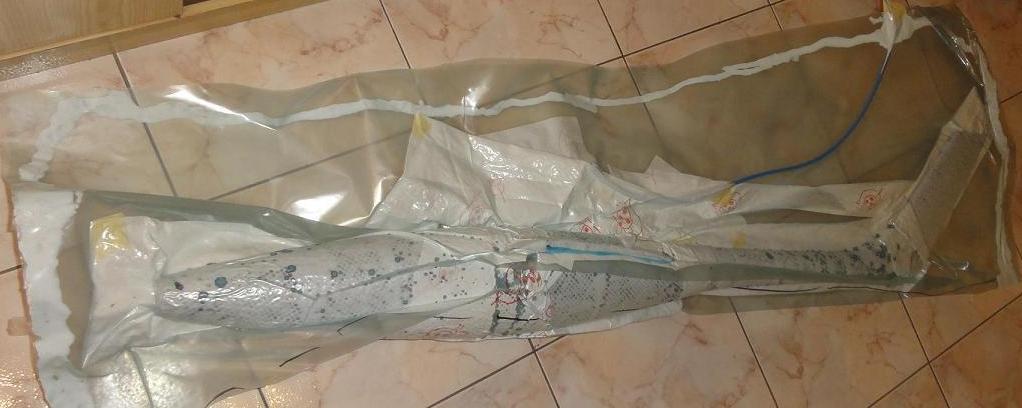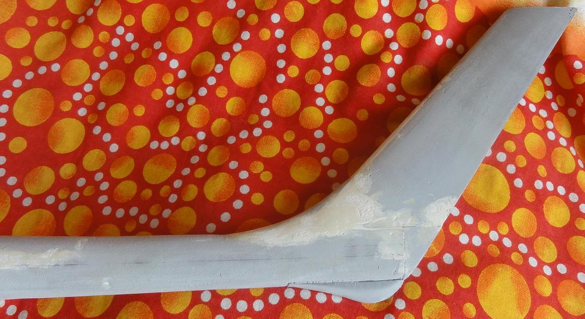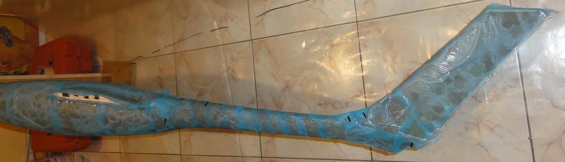 Krok Nr 5Po utwardzeniu (1-2 dni) obcinamy naddatki tkaniny i szlifujemy kadłub aby uzyskać gładką powierzchnię, wpierw papierem 150 a potem 600 z woda. Należy tylko szlifować microbalony, nie schodząc aż do włókna bo osłabi to konstrukcje. Po oszlifowaniu można pokryć jeszcze model szpachlówka samochodowa w spray-u i ponownie oszlifować papierem ściernym 600 na wodę.