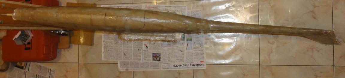 Pokrywamy kadłub dwoma warstwami tkaniny szklanej 160 g/m² i jedna 80 g/m². Po około godzinie kładziemy grubą (1-2 [mm]) warstwę microbalonów z żywicą.