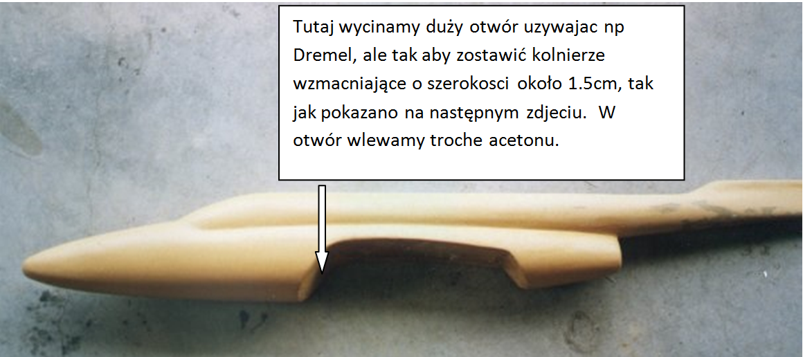 Teraz należy nalać aceton aby rozpuścić styropian. W przypadku dolnopłatów można wyciąć otwór na dole kadłuba gdzie będą skrzydła. Szpachlówka może nie być kompatybilna z acetonem, wiec trzeba ostrożnie się z nim obchodzić aby nie zrujnować swej pracy. Po rozpuszczeniu styropianu taśma powinna łatwo dać się usunąć i można kadłub wypłukać wodą. No i co? Nie było to takie trudne.