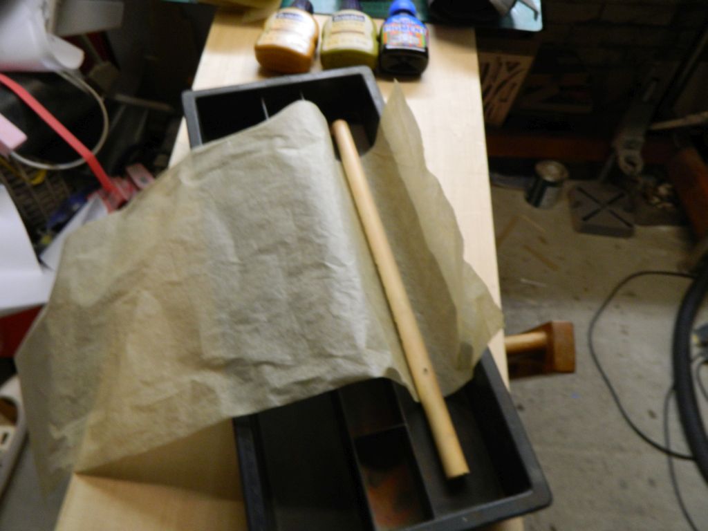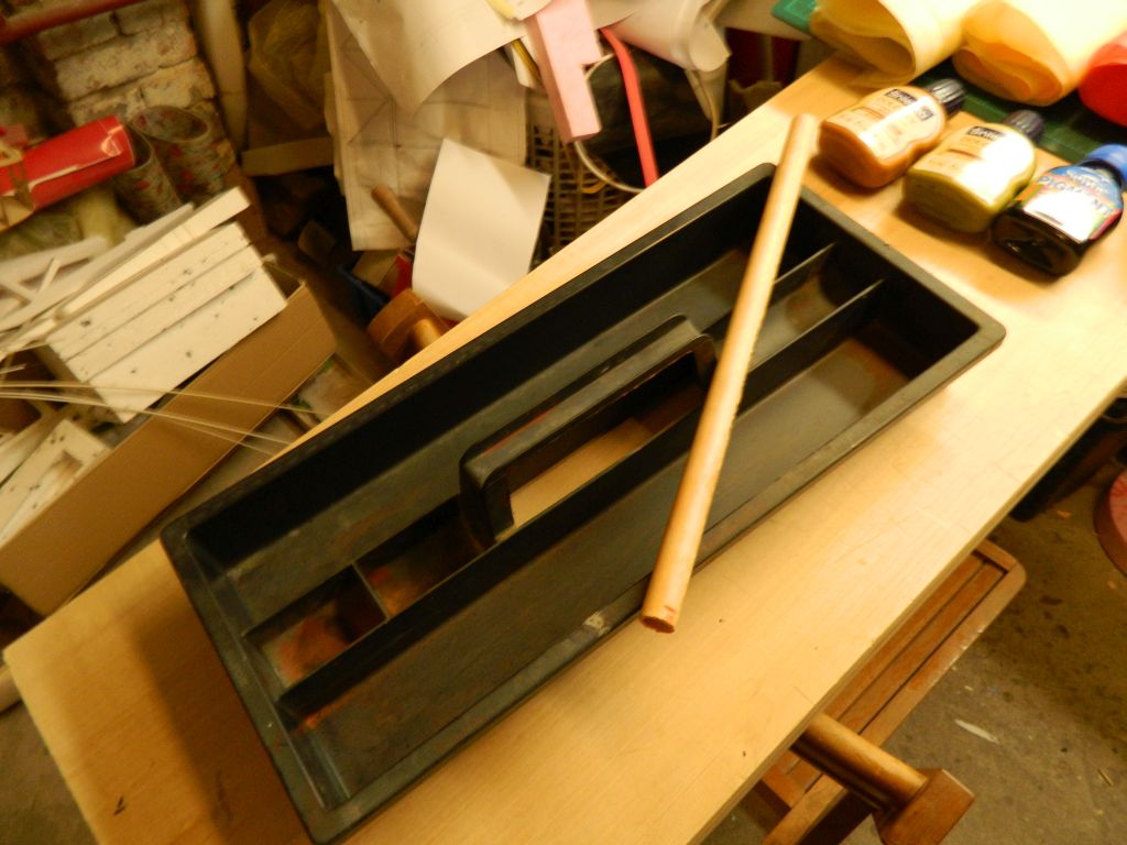 Aby w miarę szybko szło przygotowałem sobie organizer ze skrzynki na narzędzia i kawałek rurki pcv. Rozrobiłem odrobinę pigmentu z wodą. Małe kawałki japonki przygotowane wcześniej, moczyłem w roztworze, suszyłem. Jeżeli kolor/odcień odpowiadał mi, wlewałem zabarwioną wodę do jednej z przegródek w organizerze, początek arkusza japonki zanurzałem w roztworze, przyciskałem rurką i za mokry już koniec arkusza przeciągałem papier przez barwnik. Klamerkami przypinałem do sznurka, arkusz wisiał w pionie obciekając z nadmiaru barwnika. Po wysuszeniu papier prezentuje się jak na zdjęciach.