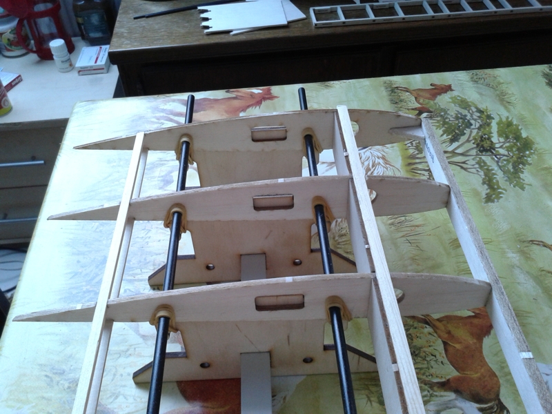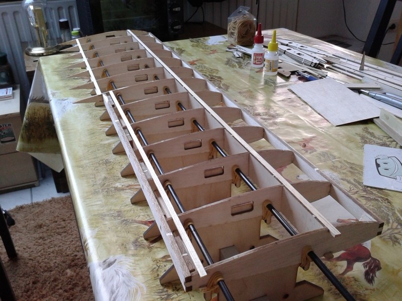 No i temat skrzydeł wykonanych tradycyjną metodą przy pomocy deski montażowej został zawieszony na kilka miesięcy. Przez przypadek, przeglądając Polskie Forum Modelarskie natknąłem się na opis prostego "urządzenia", które w pewnym sensie zastępuje deskę montażową. Koszt wykonania jest bardzo mały - kilka formatek ze zwykłej sklejki, profil aluminiowy 15 x 15 mm rurki laminatowe fi 5 i oczywiście najważniejszy element to gumki "recepturki" bez których "urządzenie" nie będzie "działało". Dodam, że bardzo spodobało mi się to urządzenie bo mogę manewrować całym płatem i bez problemu wklejać kesony i dźwigary.
