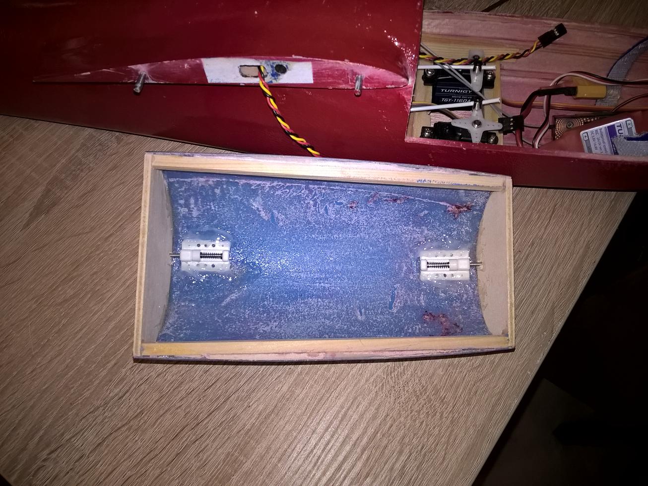 Problematyczne okazało się mocowanie owiewki - dla przypomnienia miałem tam 2 zamki - jedna łopatka po złożeniu oparła się o uchwyt zamka skutecznie blokując start silnika (zamknięcia kabiny widać w poście wyżej). Przed następnymi lotami złamałem zasuwkę zamka by już się śmigło nie blokowało.