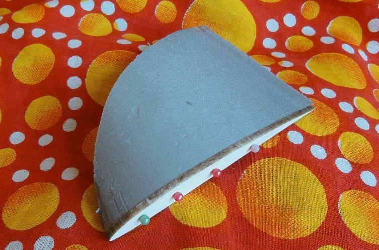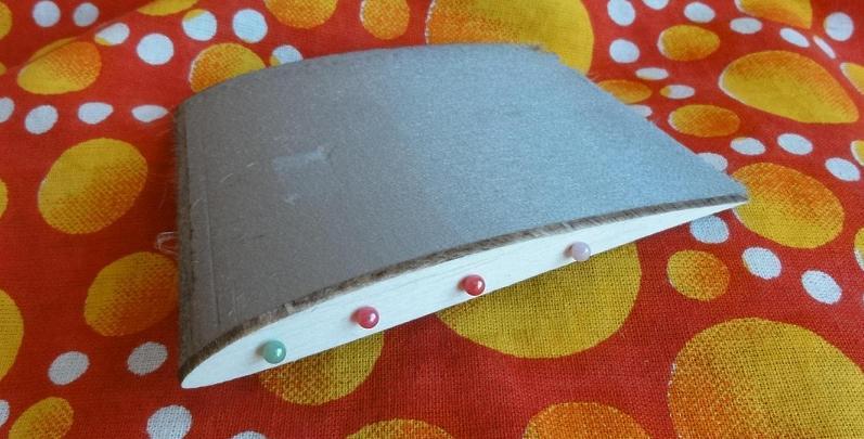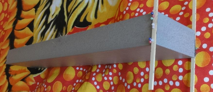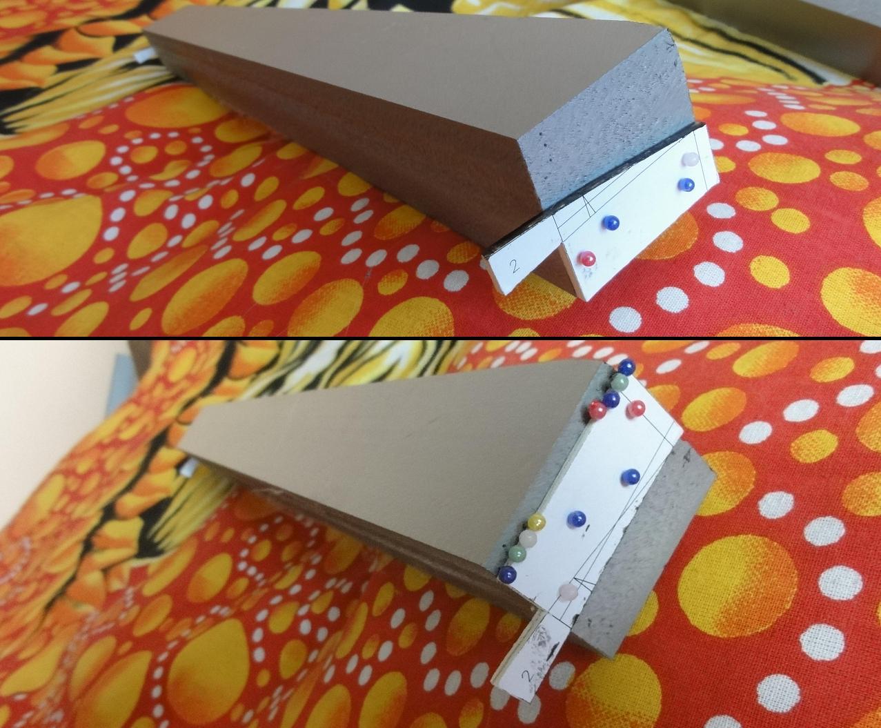 Następnie połączyłem dolny obrys i przednią część (tą owiniętą folią) szpilkami, na to położyłem rdzeń z tkaniną i dosunąłem aby od przodu tkanina zawinęła się a przód całkowicie przylegał. Następnie od góry zagiąłem tkaninę listewką i delikatnie naciągnąłem