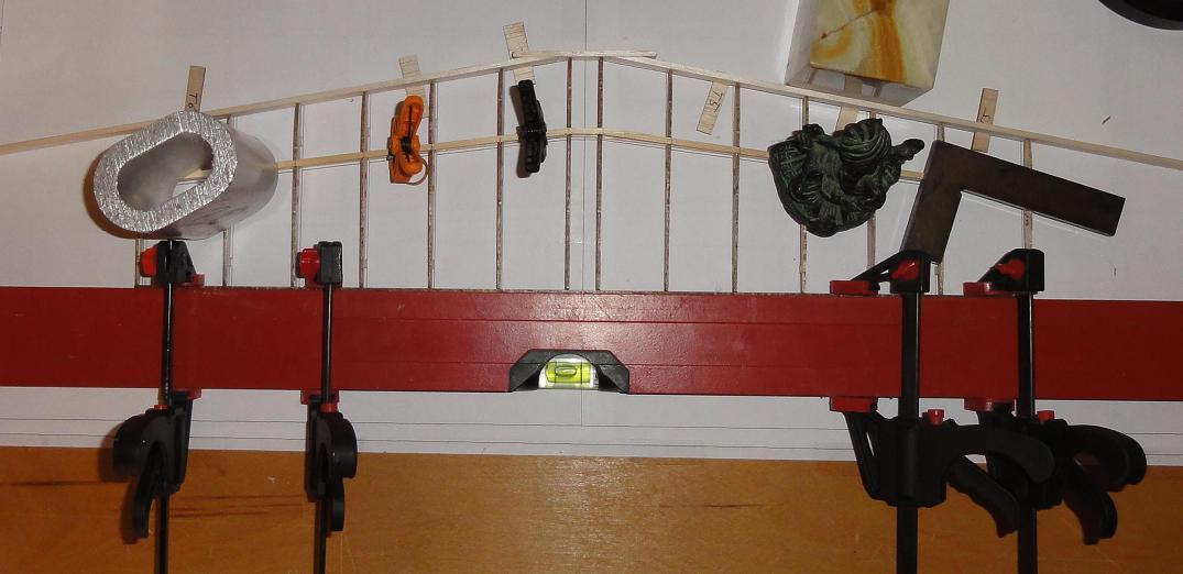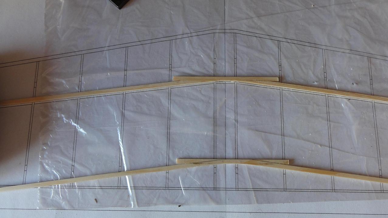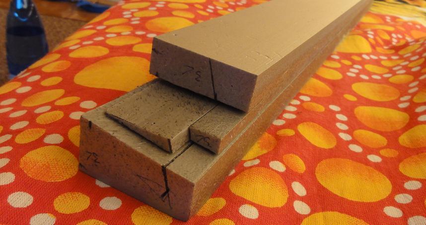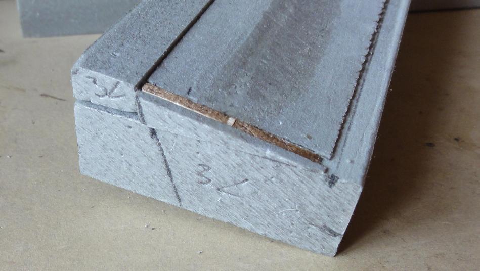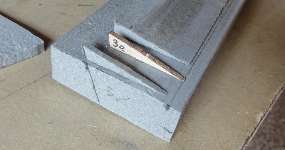 Docinam teraz rdzeń na odpowiedni wymiar i pod odpowiednim kątem. To lotka - zawias będzie w górnej części stąd podcięcie. Rdzeń położony "na plecach", przymocowany szpilkami a za prowadnice posłużyły listewki - tak jak wcześniej