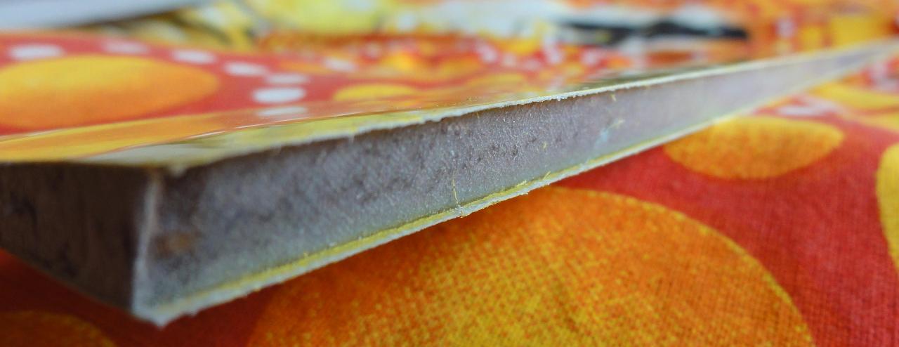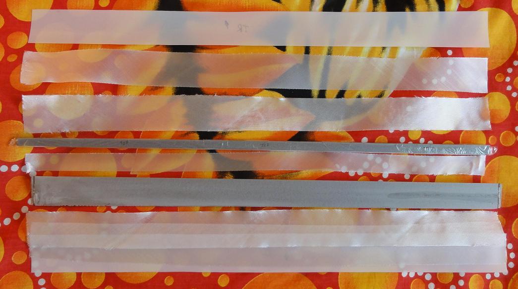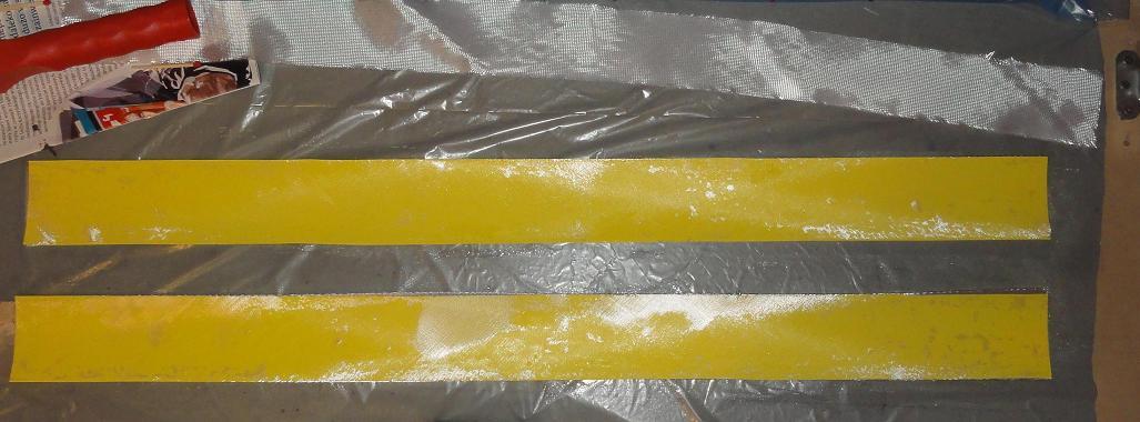 Wyrównałem je i docisnąłem do siebie. Zamocowałem je razem za pomocą szpilek wbijanych naprzemiennie pod kątem. Trzeba bardzo uważać aby nie wyszły poza obrys rdzenia! Po tej czynności naniosłem żywicę na pomalowane nakładki i ułożyłem tkaninę. Trzeba uważać, bo tkanina bardzo łatwo wydłuża się ale za to robi węższa. Po prawidłowym ułożeniu dokładnie przesączamy tkaninę i usuwamy wszystkie bąble powietrza. Kiedy to zrobimy nakładamy kolejną warstwę i robimy tak samo jak wyżej, zwracając uwagę na to aby nigdzie nie było powietrza. Na zdjęciu poniżej, całość jeszcze przed właściwym przesączeniem