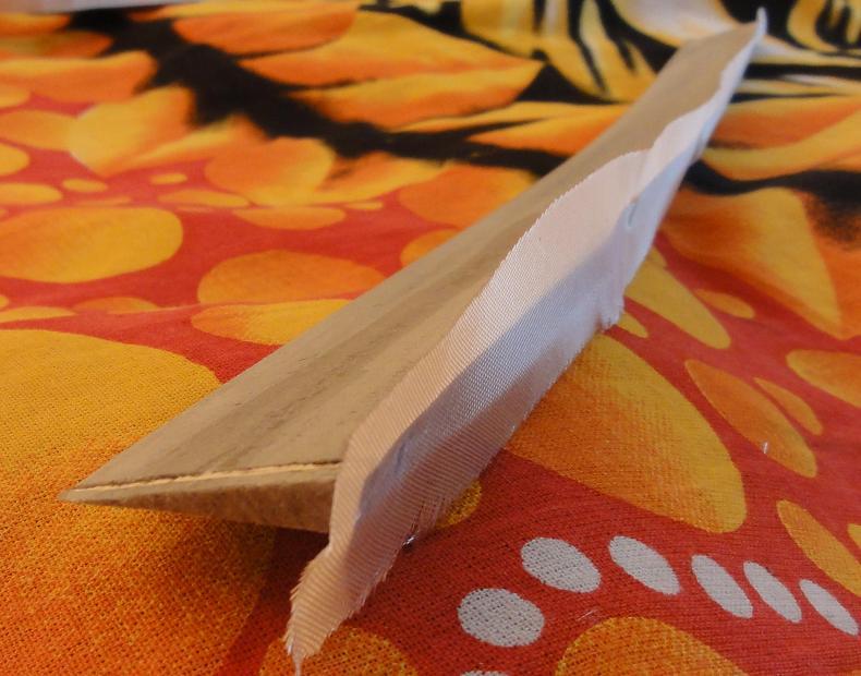 Aby wykonać całość poprawnie, najpierw przyklejam tkaninę na przednią część rdzenia lotki. Najlepiej byłoby zrobić to klejem w aerozolu (np. 3M Super 77) ale wg mnie jego cena jest zbyt wysoka do "jednorazowego" zastosowania. Zrobiłem to więc za pomocą cyjanoakrylu. Rozpuszcza on styrodur więc kropla kleju to już za dużo