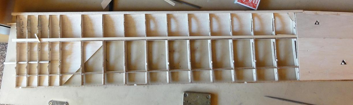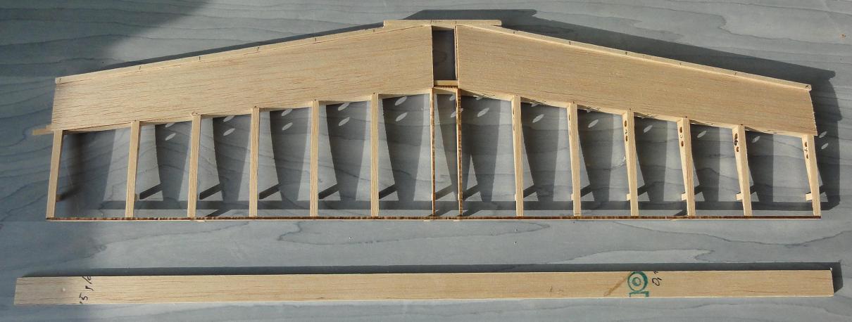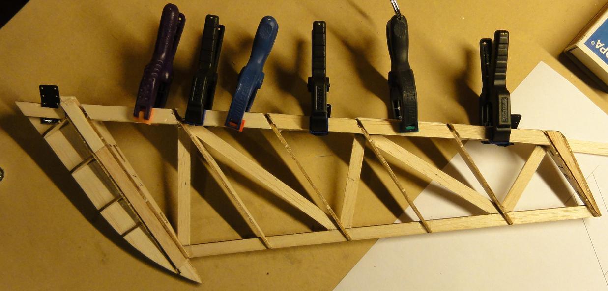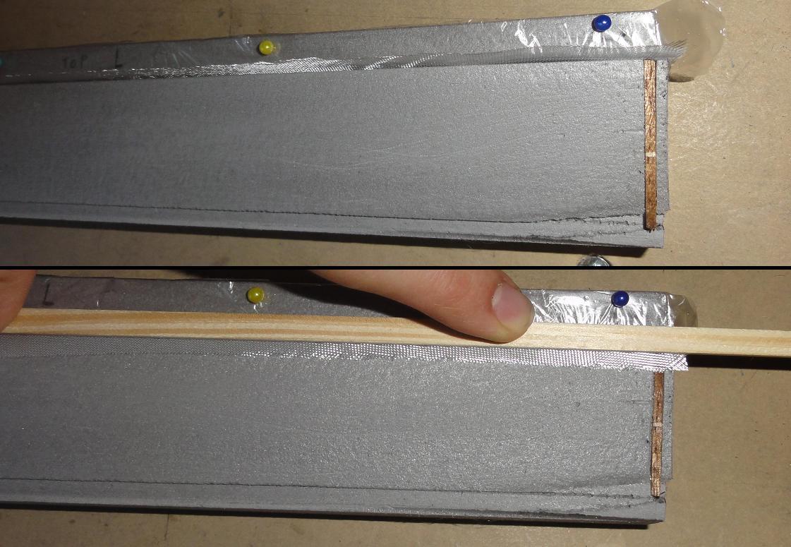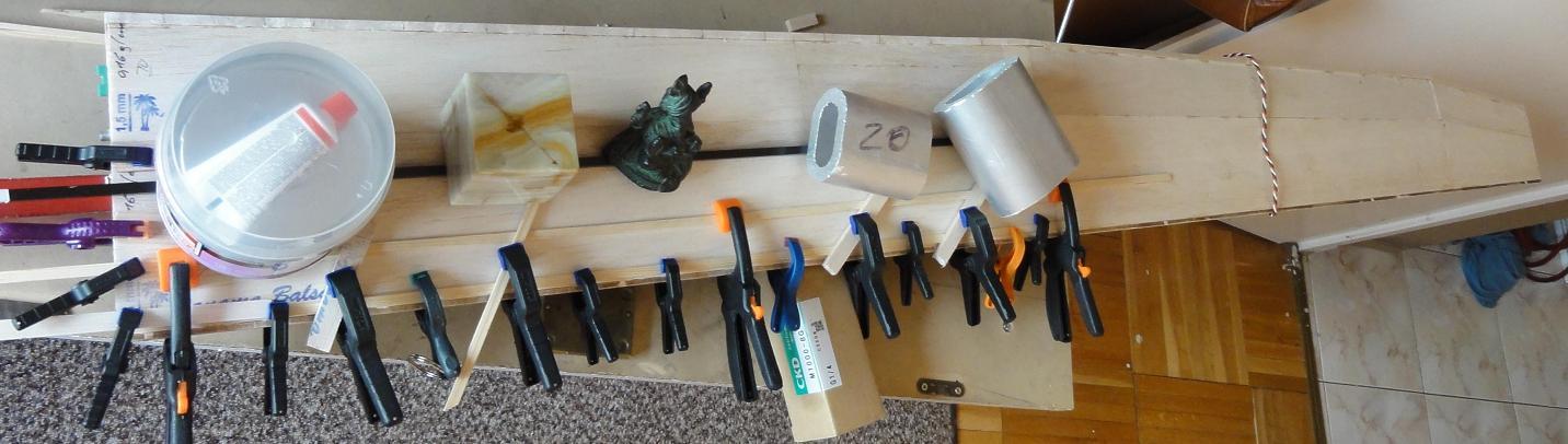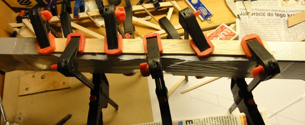 I sklejam całość. Balsę do rdzenia - klejem poliuretanowym a zewnętrzne odcinki - taśmą dwustronną. Całość ma na celu uzyskanie prostej krawędzi na końcach lotki. Bez tego końcówki byłyby węższe i zaokrąglone (w widoku z przodu). Większe ubytki w rdzeniu uzupełniłem żywicą zagęszczoną microbalonem