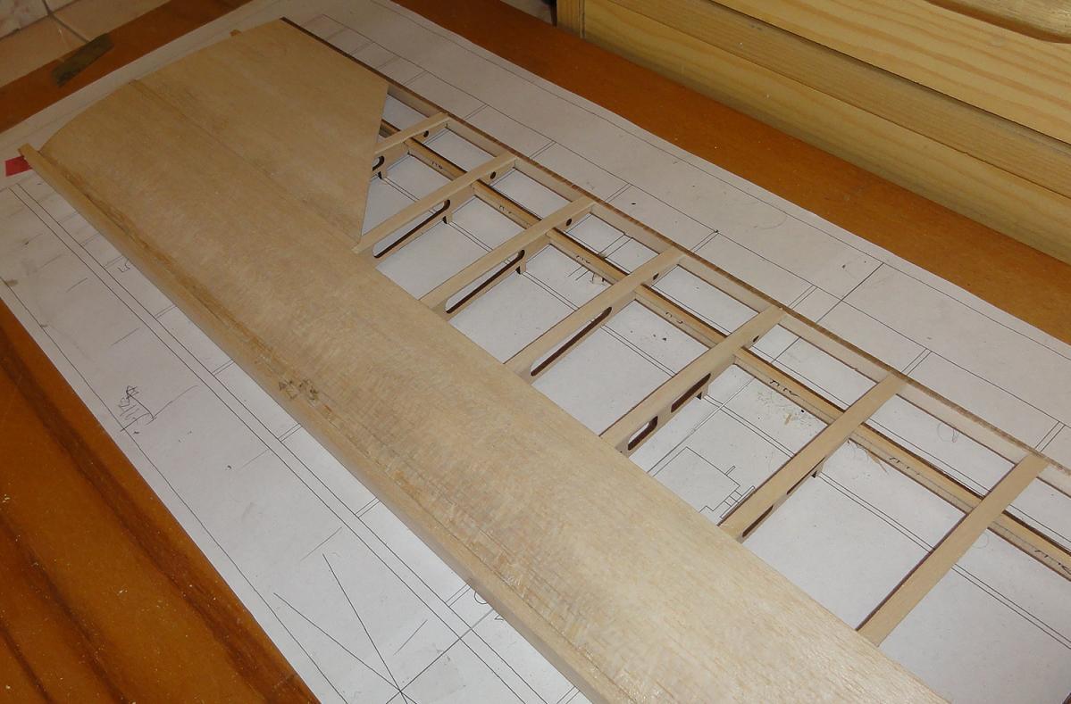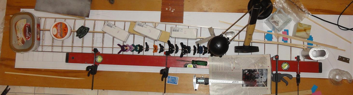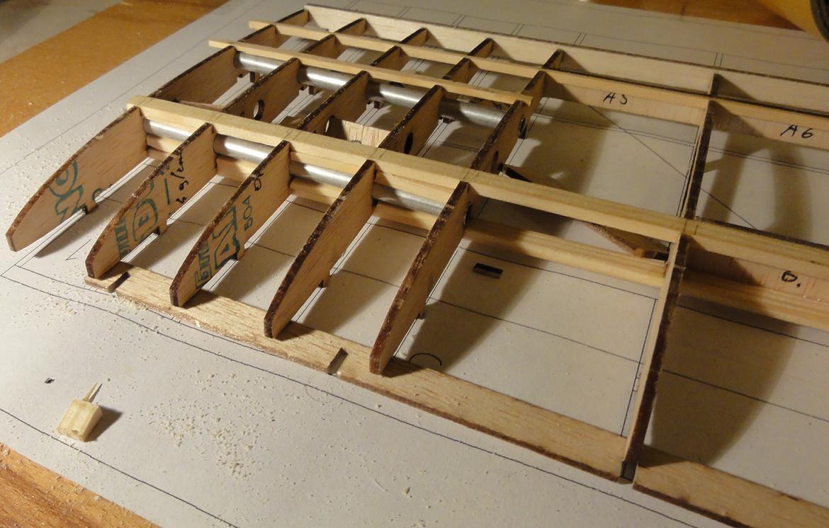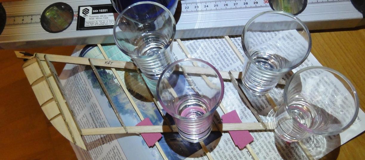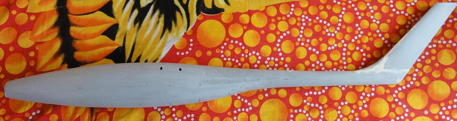 I sklejam całość. Balsę do rdzenia - klejem poliuretanowym a zewnętrzne odcinki - taśmą dwustronną. Całość ma na celu uzyskanie prostej krawędzi na końcach lotki. Bez tego końcówki byłyby węższe i zaokrąglone (w widoku z przodu). Większe ubytki w rdzeniu uzupełniłem żywicą zagęszczoną microbalonem