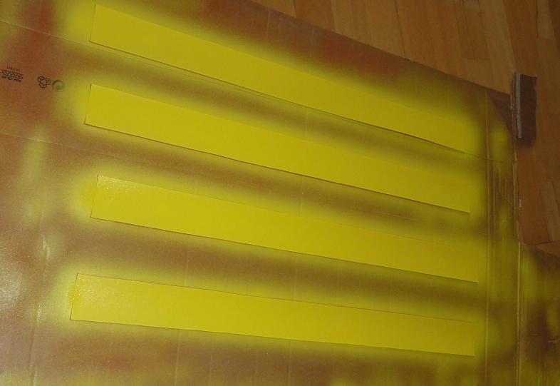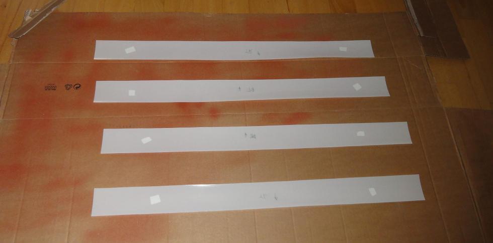). Nałożyłem 3 warstwy, polerując każdą po wyschnięciu. Później przykleiłem nakładki na karton za pomocą taśmy dwustronnej. Trzeba ją mocno przycisnąć aby nie odkleiła się - najlepiej całość postawić na pionowo i zobaczyć czy np. po 30 min. nie chce się odkleić. Bo jak odpadnie nam jedna gdy farba będzie mokra - nic wesołego...