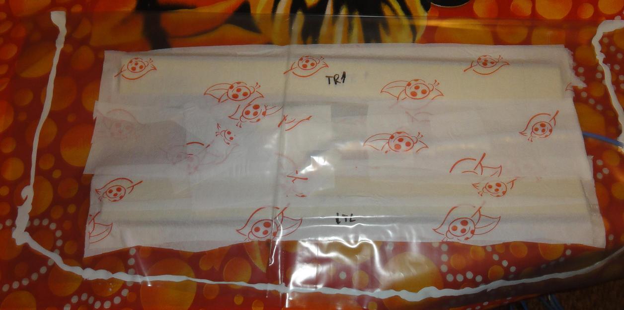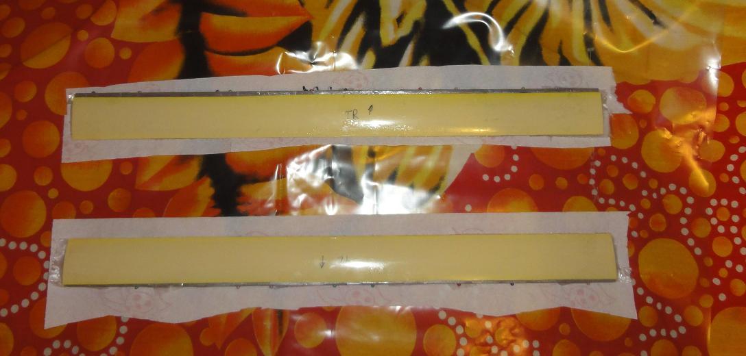 Wycinam potrzebny arkusz folii do laminowania próżniowego. Folia to taka "ogrodnicza" o grubości chyba ≈0,1÷0,15 [mm]. Na folię kładę kawałki ręcznika papierowego nieco większe niż gabaryt rdzeni z nakładkami. Na ręcznikach układam wspomniane rdzenie (strzałkami oznaczyłem przód)