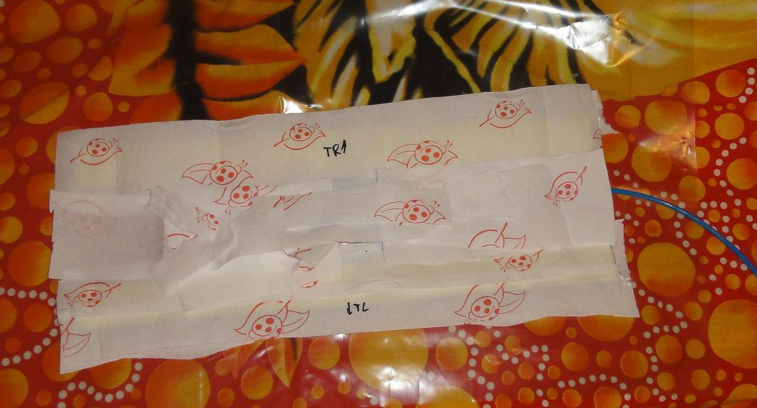 Między elementami umieszczam końcówkę przewodu (wlot owinięty ręcznikiem papierowym) i przyklejam go do folii. Następnie na całość daję 1 warstwę ręczników papierowych