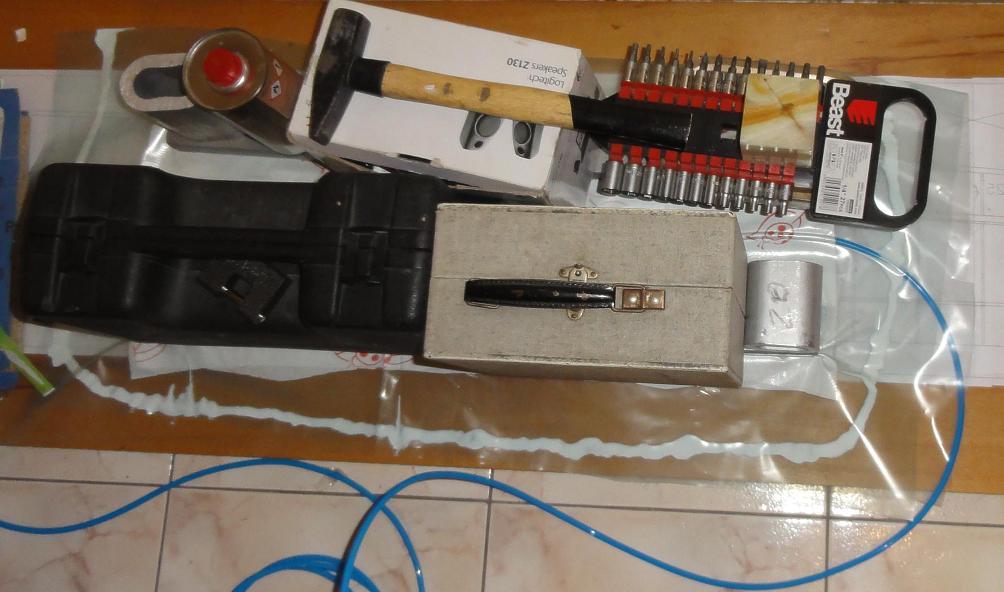 Następnie odsysam powietrze. Zastosowałem podciśnienie rzędu -0,7 [bar]. Rdzenie trzeba równo ułożyć na dolnym obrysie. Z racji takiej, że rdzenie są wiotkie (mogą się wyginać ja banan w widoku z góry) ważne jest aby ułożyć je prosto. Najlepiej na początku dać małe podciśnienie i przymocować (wyrównać) rdzenie do dolnych obrysów za pomocą kleju termicznego (od przedniej strony). Po tej czynności odsysam powietrze do zadanej wartości i przykładam górne obrysy przyklejając je w 3 miejscach klejem termicznym. Całość idzie teraz na płaską deskę i dodatkowo zostaje dociśnięta na czas wiązania żywicy