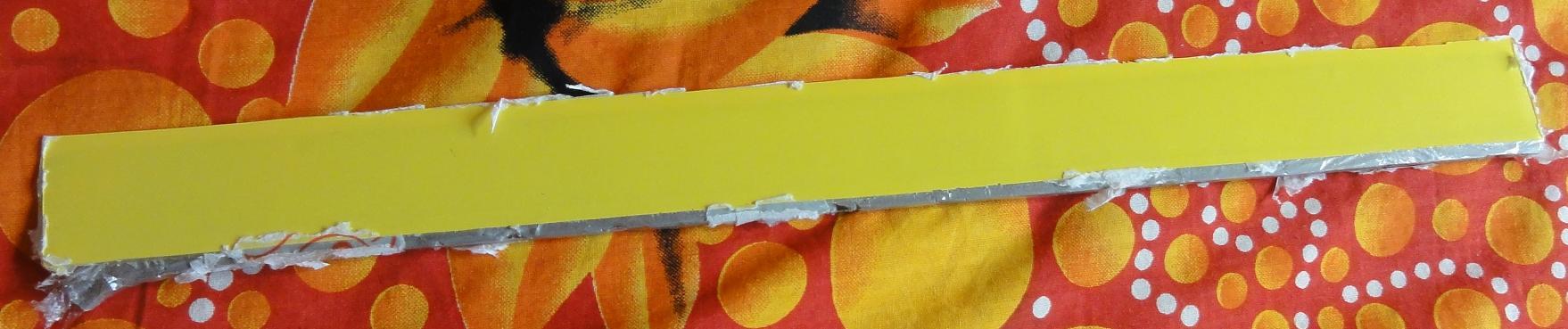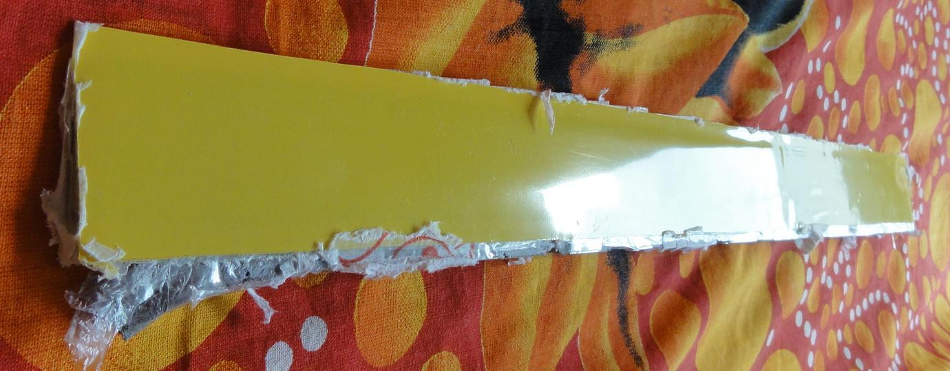 Następnie wyciąłem szablony z mylaru (0,25 mm) oraz tkaninę. Prawdopodobnie wystarczy 2x50 [g/m²] ale trochę się obawiam sztywności. Dlatego zastosowałem 50-tkę i 80-tkę. Oczywiście 50-tka od zewnątrz. Włóka pod kątem 45°. Zestaw tkanin na jedną lotkę waży 8,3 [g]. Będę miał odniesienie co do ilości potrzebnej żywicy (przyjmuje się proporcje wagowe 1/1). Przednią część styroduru owinąłem folią - z woreczków śniadaniowych i skleiłem taśmą bezbarwną (od zewnątrz)