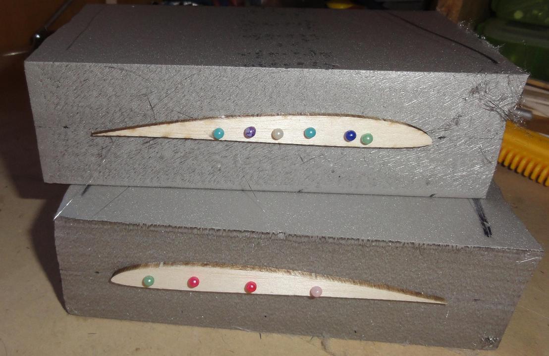 Zaczynam od wycięcia bloku styroduru gorącym drutem. Blok jest większy niż sama lotka. Do prowadzenia drutu używam przytwierdzonych listewek