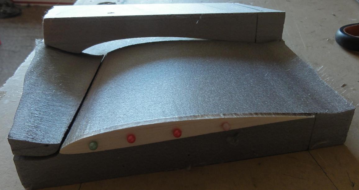 Szablony muszą być pewnie przymocowane. Jeśli nie - w końcówce będzie większe ścięcie i rdzeń styrodurowy nie będzie dochodził do końca (u mnie krawędź rdzenia lotki jest oddalona o 5 mm od końca styroduru). W przypadku małych odcięć można to zignorować. W przypadku dużych - trzeba wykonać na nowo rdzeń. Tak przedstawia się bryła po cięciu