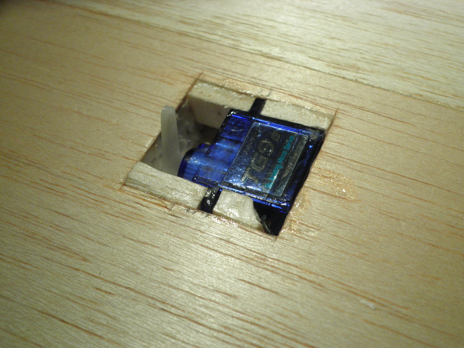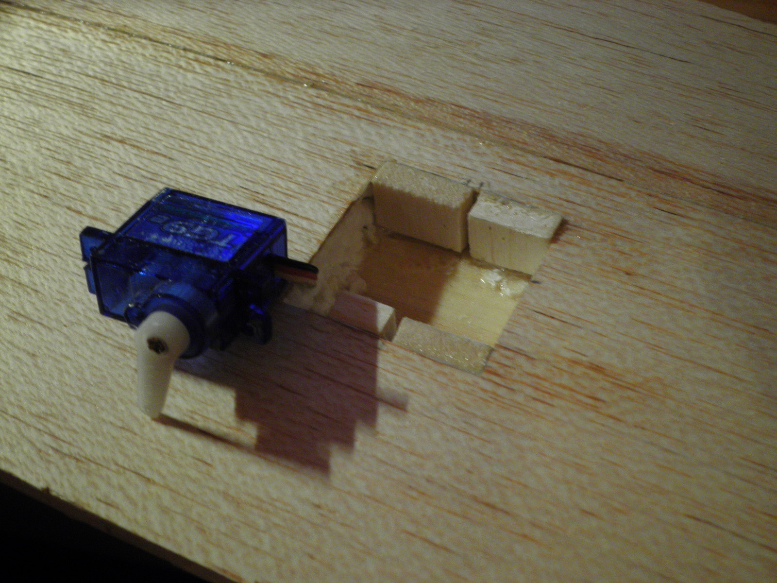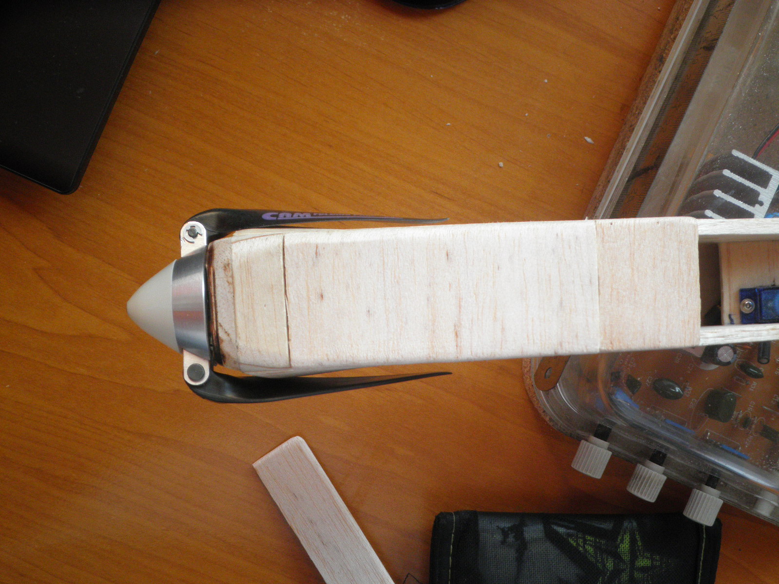 Serwo w skrzydło wchodzi na wcisk ( wiem, średnio estetycznie wyszło, zostanie jeszcze wyrównane ), i zostanie od góry złapane małymi śrubkami, tak dla pewności. Do tego planuje wykonać przeźroczystą osłonę serwa z butelki PET ( nie wiem czy to wypali, ale mam ochotę spróbować ). Balsowe klocki wklejone na Soudal i delikatnie przyłapane CA w celu złapania wymiaru :)