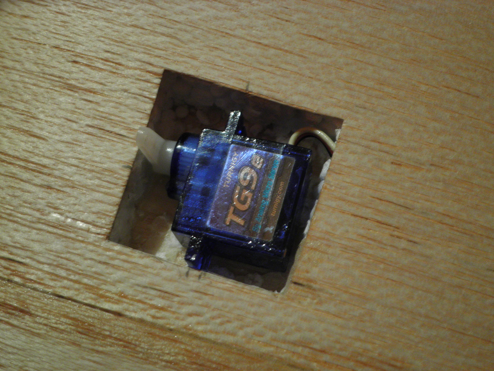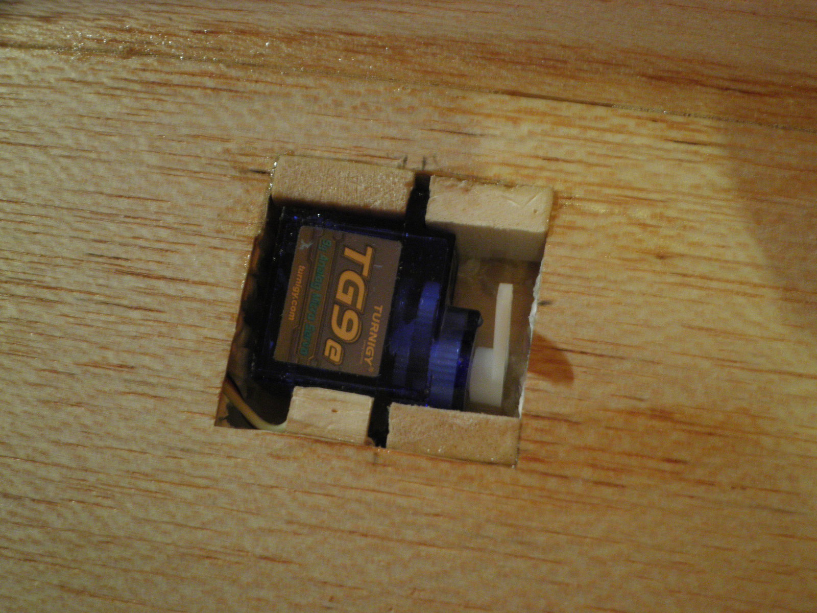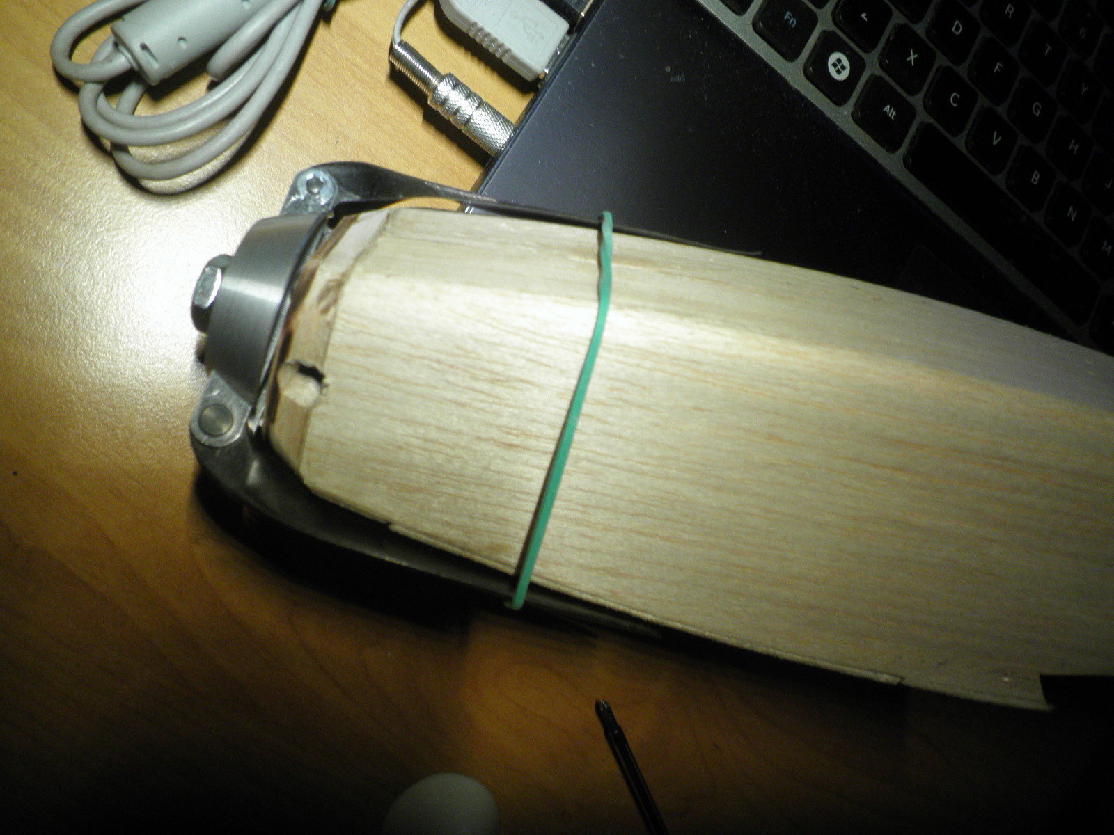 Serwo w skrzydło wchodzi na wcisk ( wiem, średnio estetycznie wyszło, zostanie jeszcze wyrównane ), i zostanie od góry złapane małymi śrubkami, tak dla pewności. Do tego planuje wykonać przeźroczystą osłonę serwa z butelki PET ( nie wiem czy to wypali, ale mam ochotę spróbować ). Balsowe klocki wklejone na Soudal i delikatnie przyłapane CA w celu złapania wymiaru :)