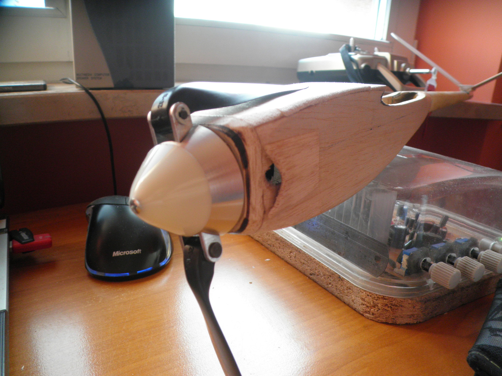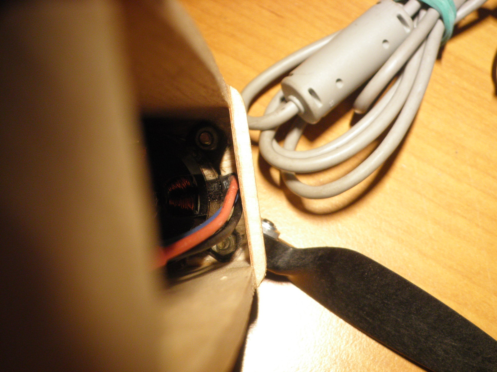 Silnik przekręciłem kablami do góry, zrobiło się baaaaardzo ciasno, ale się udało. No i oszlifowałem jeszcze kąciki. Jakby kąt "zagięcia" łopatek wydawał się dalej za duży, można trochę oddalić kołpak od kadłuba, i kąt się jeszcze zmniejszy.