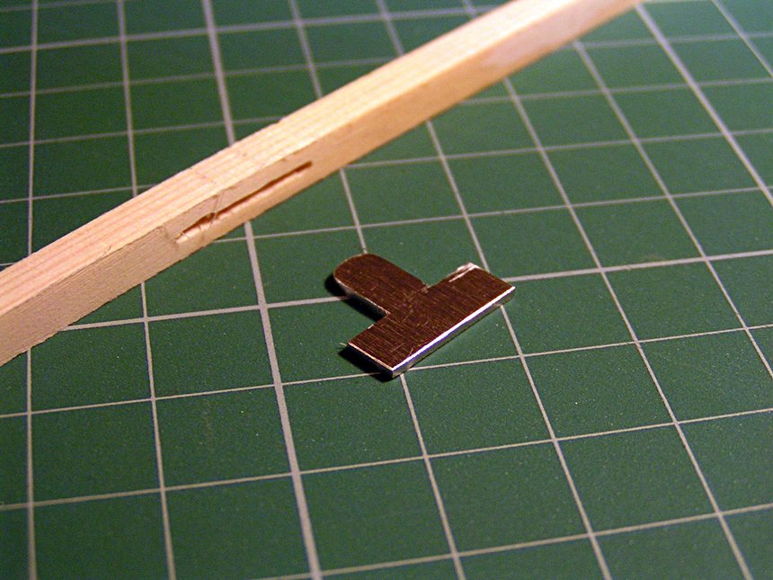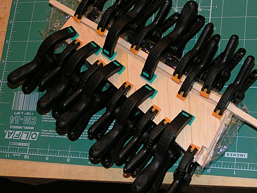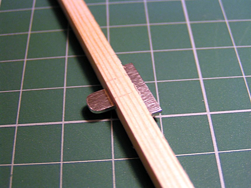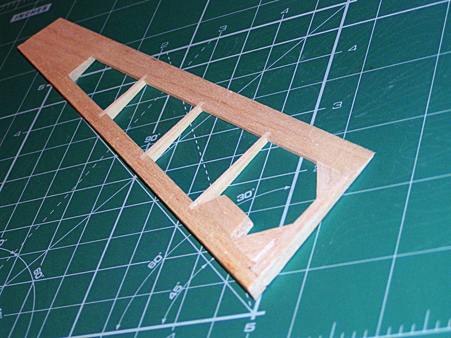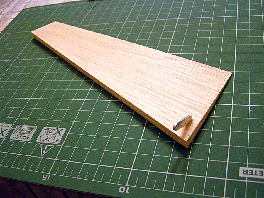 Ster statecznika pionowego kleiłem troszkę inaczej, ze względu na jego klinowy przekrój. Najpierw z odpadków balsy 4mm wykonałem dwa "elementy dociskowe", sklejone klejem CA: