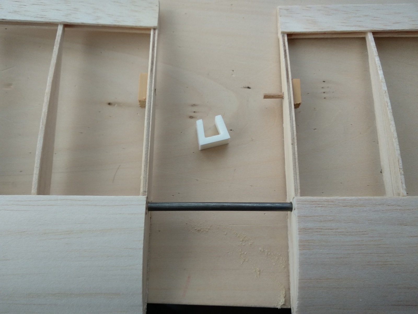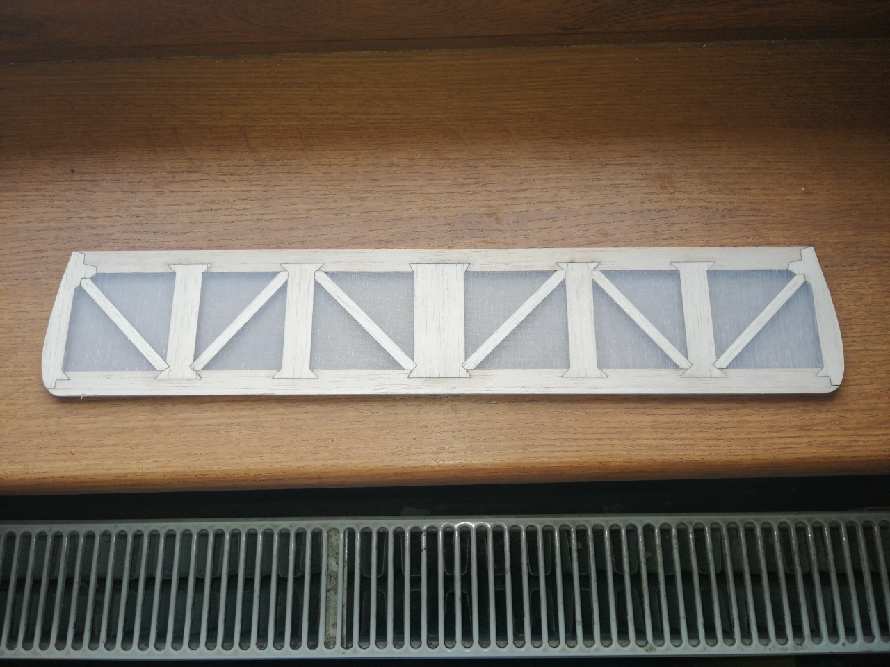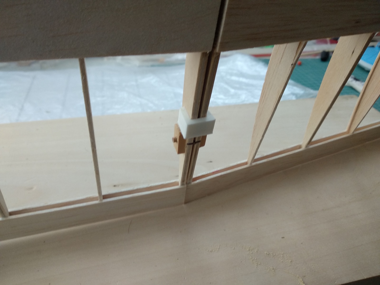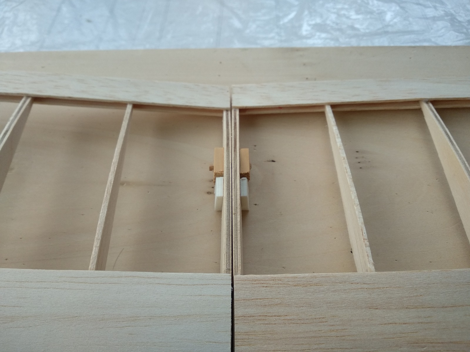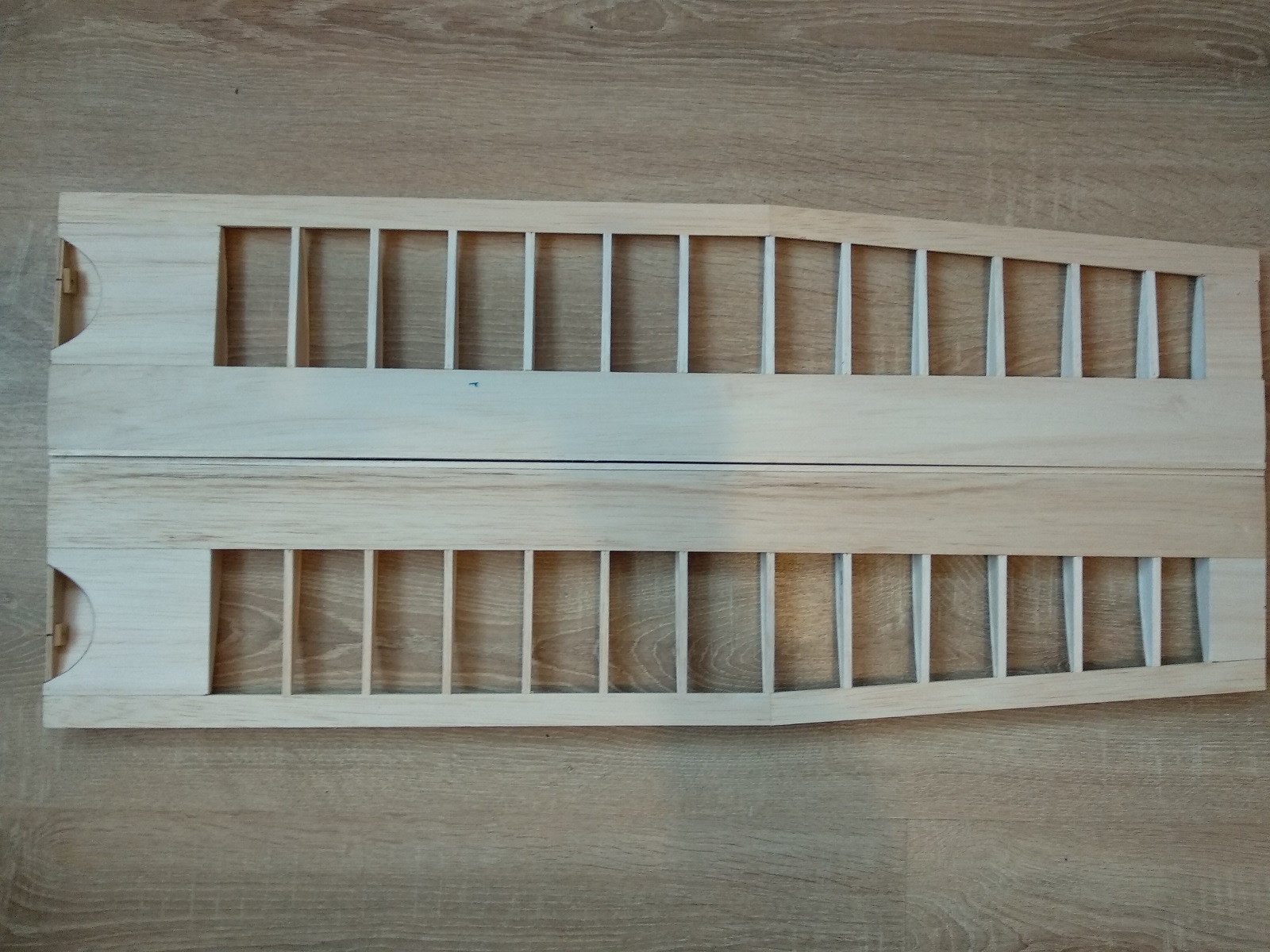 Skrzydła w zasadzie gotowe, zostało oszlifować natarcie i przykleić końcówki. Tak się to prezentuje od spodu, przy żebrach nasadowych widoczne podcięcie by był dostęp do spinania ich razem.