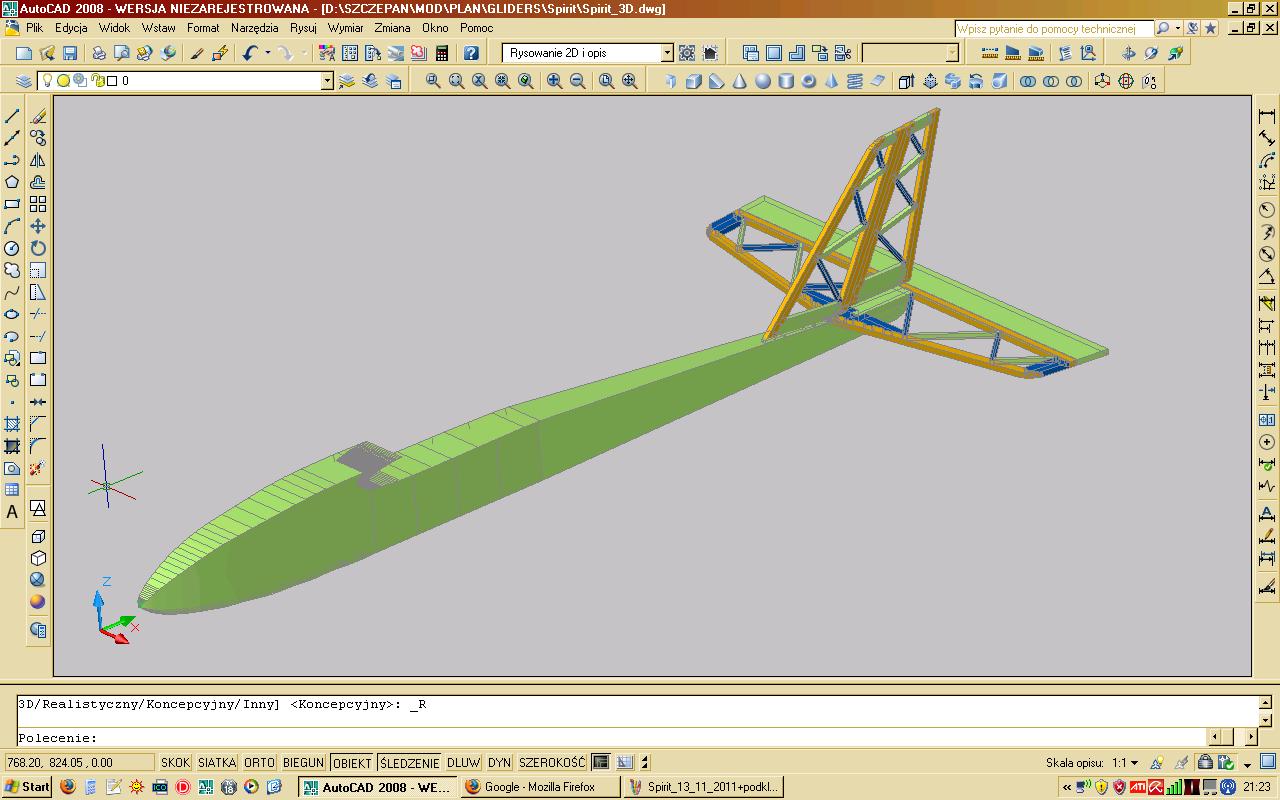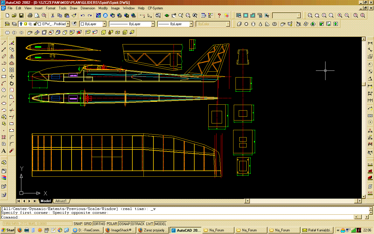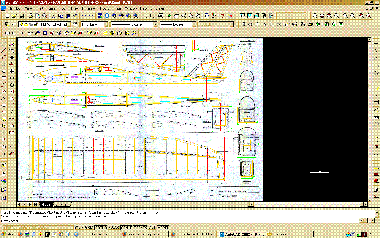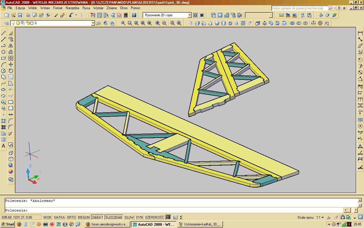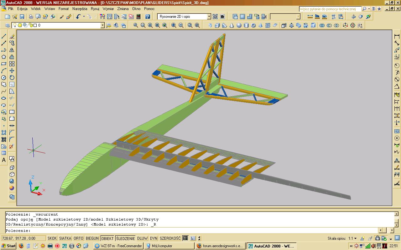 Czyli jak widać - rozrysowałem, myślę, że dokładnie, ustrzeżenie poziome i pionowe, zacząłem walkę z elementami kadłuba - dobór kształtu i położenia wpustów/wypustów montażowych ścian bocznych, spodu i grzbietu kadłuba, opracowuję kształt poprzecznych do osi kadłuba wręg wewnętrznych, a także półki pod serwomechanizmy, odbiornik i akumulatory, półki pod kabinkę, rozrysowuję żebra - o różnej cięciwie, dobieram wysokości pasów skrzynki dźwigara, no i myślę nad wieloma innymi rzeczami