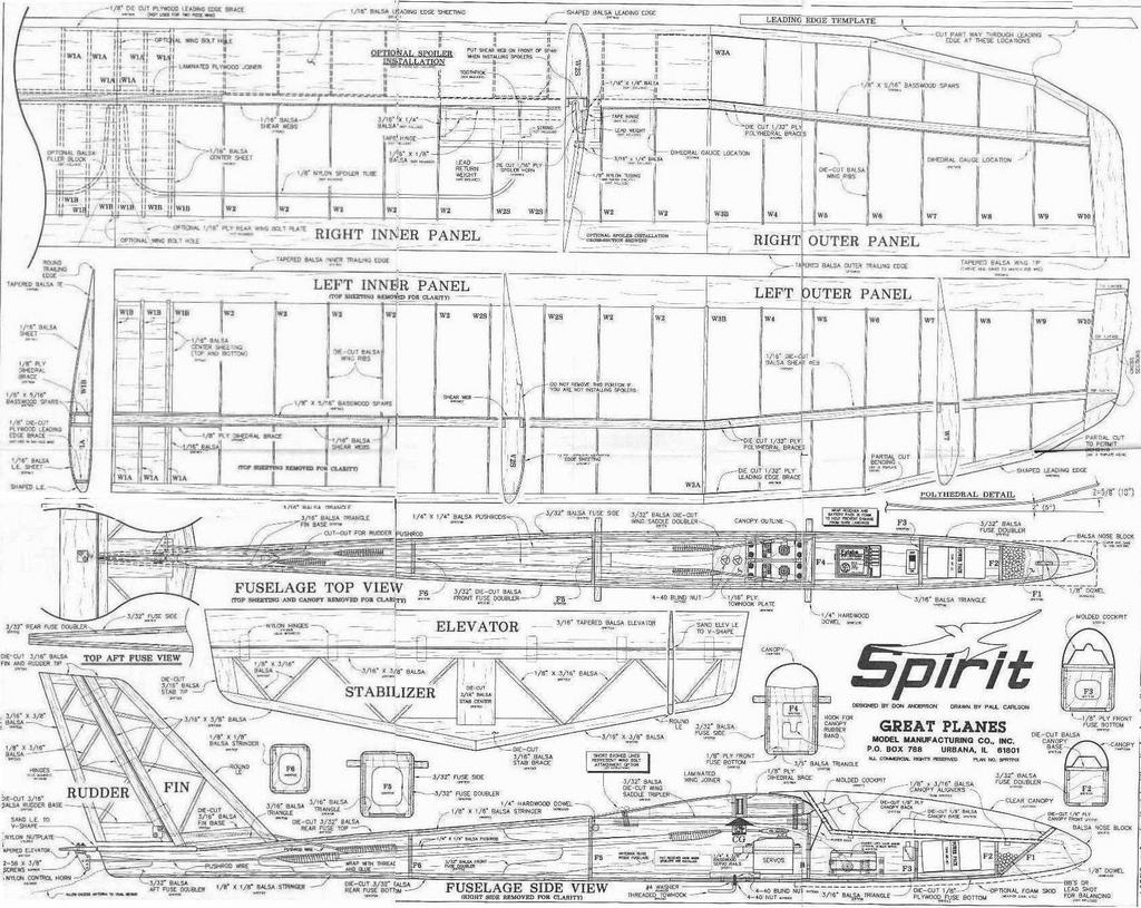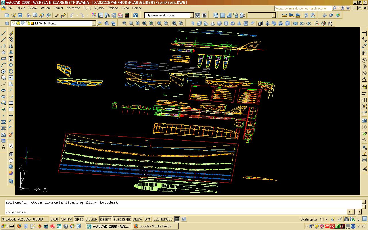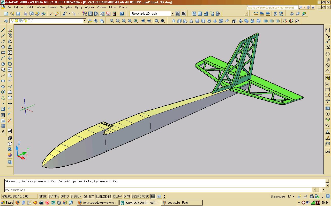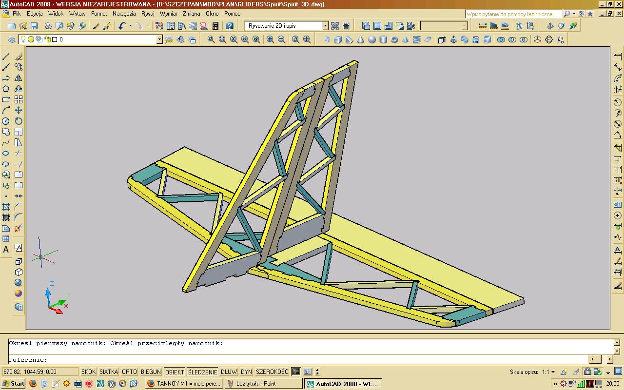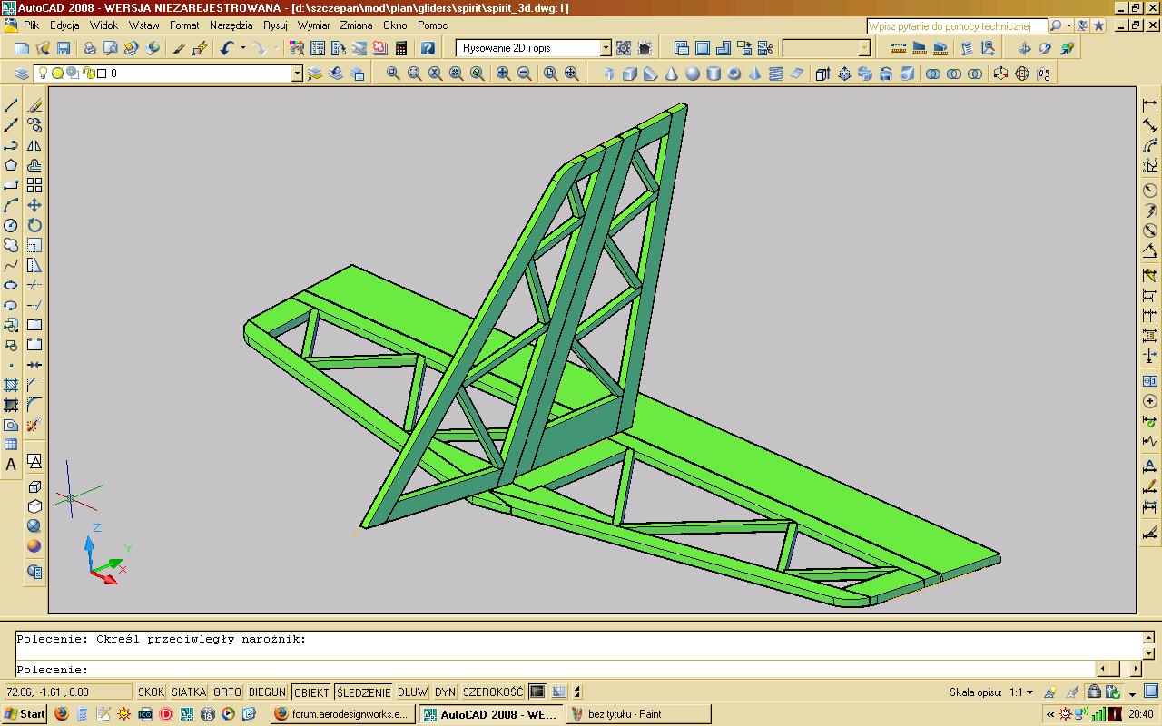 Czyli jak widać - rozrysowałem, myślę, że dokładnie, ustrzeżenie poziome i pionowe, zacząłem walkę z elementami kadłuba - dobór kształtu i położenia wpustów/wypustów montażowych ścian bocznych, spodu i grzbietu kadłuba, opracowuję kształt poprzecznych do osi kadłuba wręg wewnętrznych, a także półki pod serwomechanizmy, odbiornik i akumulatory, półki pod kabinkę, rozrysowuję żebra - o różnej cięciwie, dobieram wysokości pasów skrzynki dźwigara, no i myślę nad wieloma innymi rzeczami