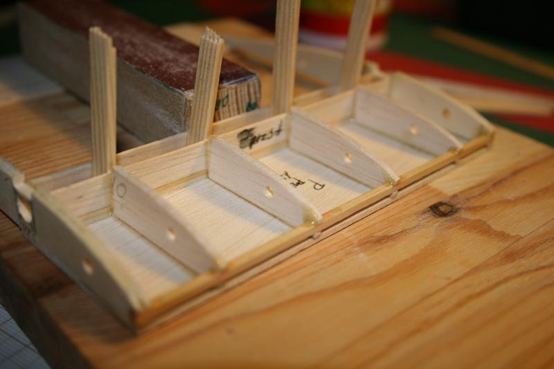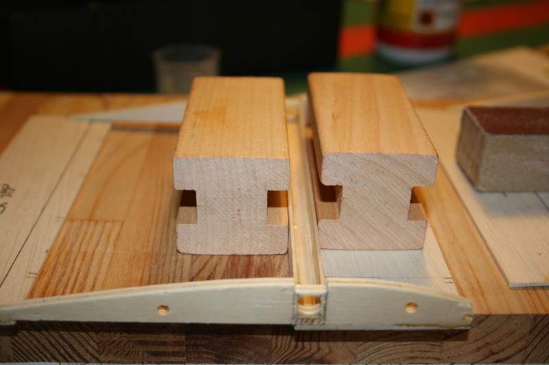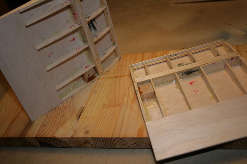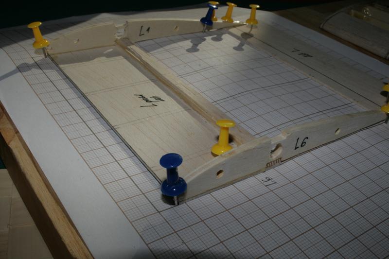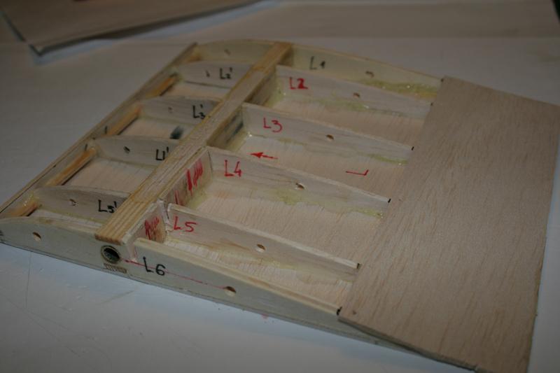 Przykleiłem dolny dźwigar do dna kesonu (balsa 1,5 mm). Na dźwigar przykleiłem balsową listewkę o szer. 6mm i grubości 1 mm. Zrobiłem to, by wypełnić nadmiar przestrzeni pod rurką na pręt. Najpierw wkleiłem skrajne żebra. Będą jeszcze wzmocnione małymi klockami od wewnątrz, tak aby było w co wkręcić haczyki na gumę.