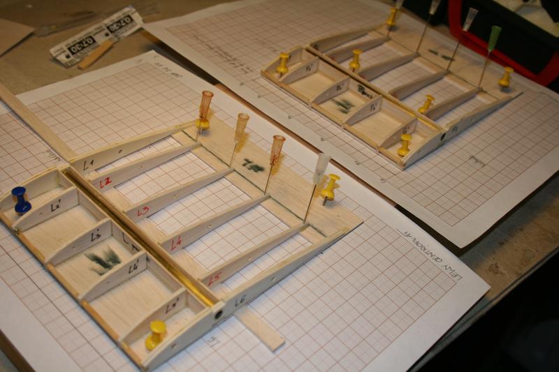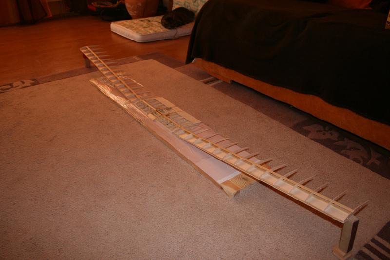 Na noc przybiłem konstrukcję do deski i lekko zmoczyłem wodą w celu zniwelowania niewielkiego zwichrowania prawej krawędzi spływu. Stąd rozmyte napisy na elementach. Nie do końca jestem przekonany czy tak się robi, ale dzisiaj po całej nocy i dniu "przyszpilenia" wszystko jest równe. Zobaczę na jak długo.