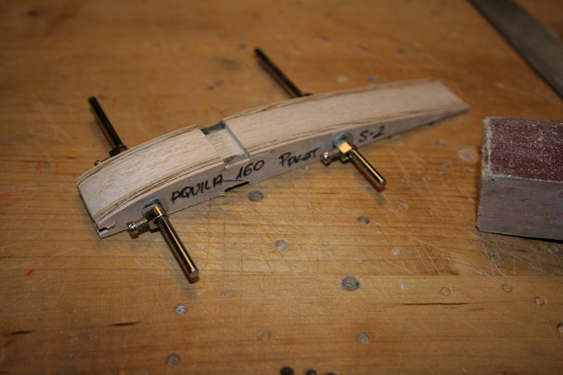 Korzystając z porad umieszczonych na forum pracuję nad centropłatem. Skrajne sklejkowe żebra wykonałem ponownie (sklejka 3mm), ponieważ te poprzednie miały otwory na bagnet wywiercone trochę krzywo. Dochodzę do wprawy w ich struganiu