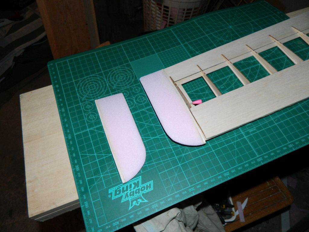 Spływy, nakładki, przekładki itp, nic ciekawego ;) . Wciągającą odskocznią od tego wszystkiego były końcówki płatów. Wystrugałem je ze styroduru i balsy, no i oczywiście przymiarka. Na końcówki położę szkło, szlif i malowanie.