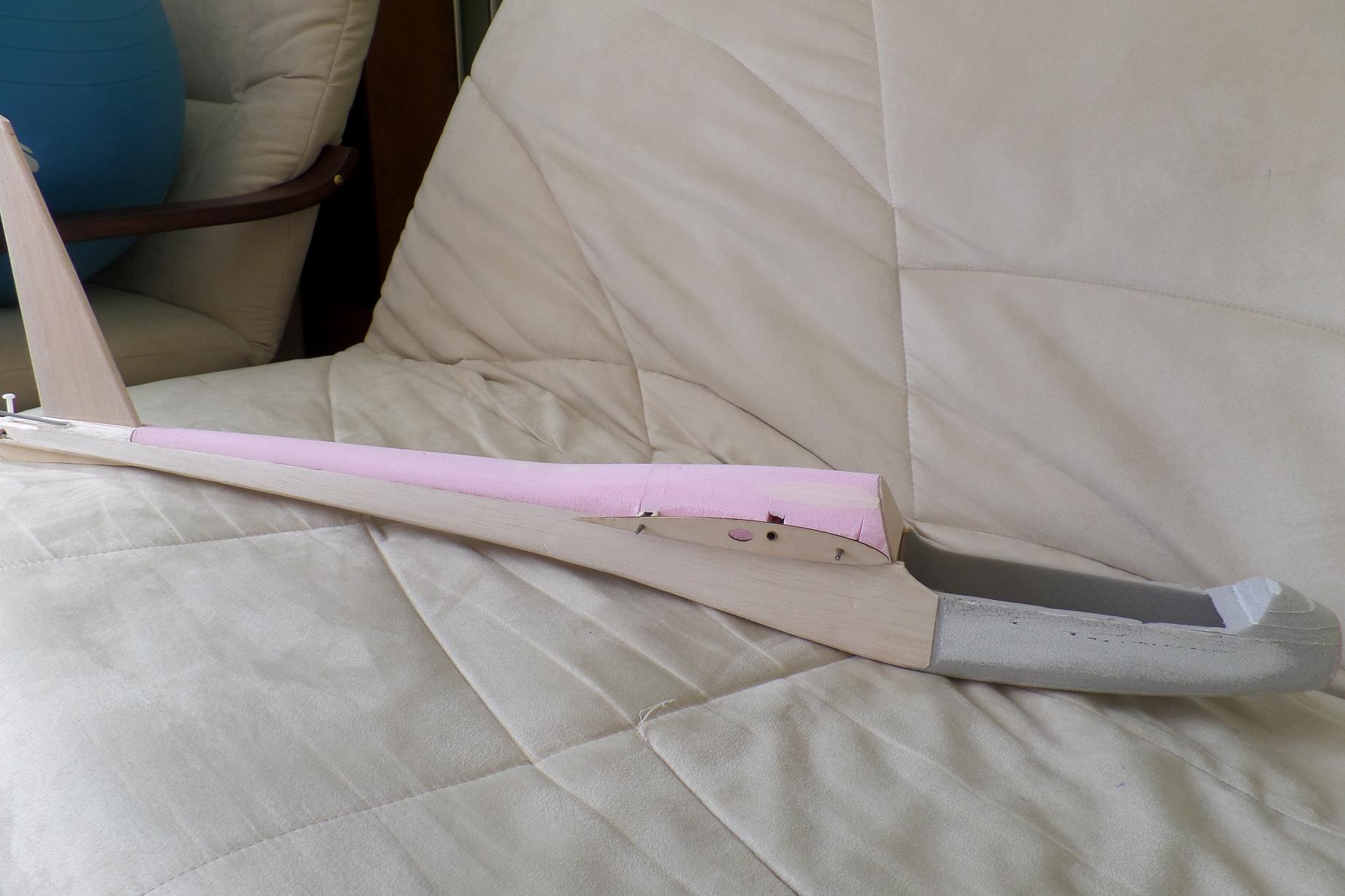 Następny krok, mocowanie bowdenów, pokrycie garbu styrodurem i szlifowanie.