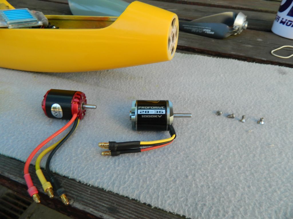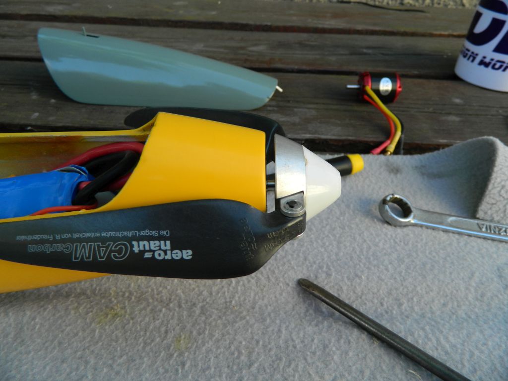 Silnik "goły" tzn bez śrubek i innych akcesoriów, typowych dla silników elektrycznych. Po otworzeniu paczuszki uderzyła mnie staranność wykonania, precyzja itd. Powiem szczerze , że byłem zaskoczony :) . Otwory we wrędze na śruby mojego modelu są tak umiejscowione, że musiałem obrócić silnik....kable znajdują się po prawej stronie kadłuba. Nie po mojej myśli, ale są sztywne - co utrudnia trochę montaż - i nie dotykają obudowy silnika. Druga sprawa to długość ośki....w poprzednim była krótsza o 3 mm i kołpak ładnie przylegał do wręgi, w tym jest dłuższa i teraz jest 3 mm szpara ;) . Tak samo ma MPjecie i Pelikanie....trudno, poprawi się kadłub, teraz szybko model do samochodu i na lotnisko :D